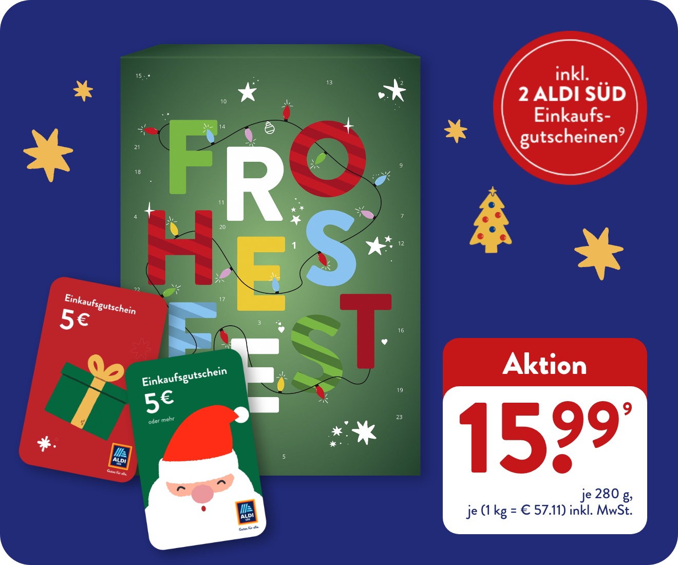 9 Die Einkaufsgutscheine werden von der transact Elektronische Zahlungssysteme GmbH, Fraunhoferstr. 10, 82152 Martinsried („transact“) ausgegeben. Dein Vertragspartner in Bezug auf die Einkaufsgutscheine ist nur transact; ALDI SÜD handelt im Namen und im Auftrag von transact. Für die Nutzung der Einkaufsgutscheine gelten die „Allgemeinen Geschäftsbedingungen für Einkaufsgutscheine“. Diese sind einsehbar unter www.aldi-sued.de/de/informationen/einkaufsgutschein-aktion, liegen in allen teilnehmenden ALDI SÜD Filialen zur Einsicht aus und werden auf Verlangen auch als Kopie zur Verfügung gestellt. Die Einkaufsgutscheine können ab 1.12.25 nur in ALDI SÜD Filialen in Deutschland eingelöst werden. Das Guthaben auf den Einkaufsgutscheinen wird nicht verzinst und nicht gegen Bargeld ausbezahlt. Die Einkaufsgutscheine sind bis zum 30.6.26 gültig. Bitte bewahre die Einkaufsgutscheine wie Bargeld auf, bei Verlust oder Diebstahl erfolgt kein Ersatz.