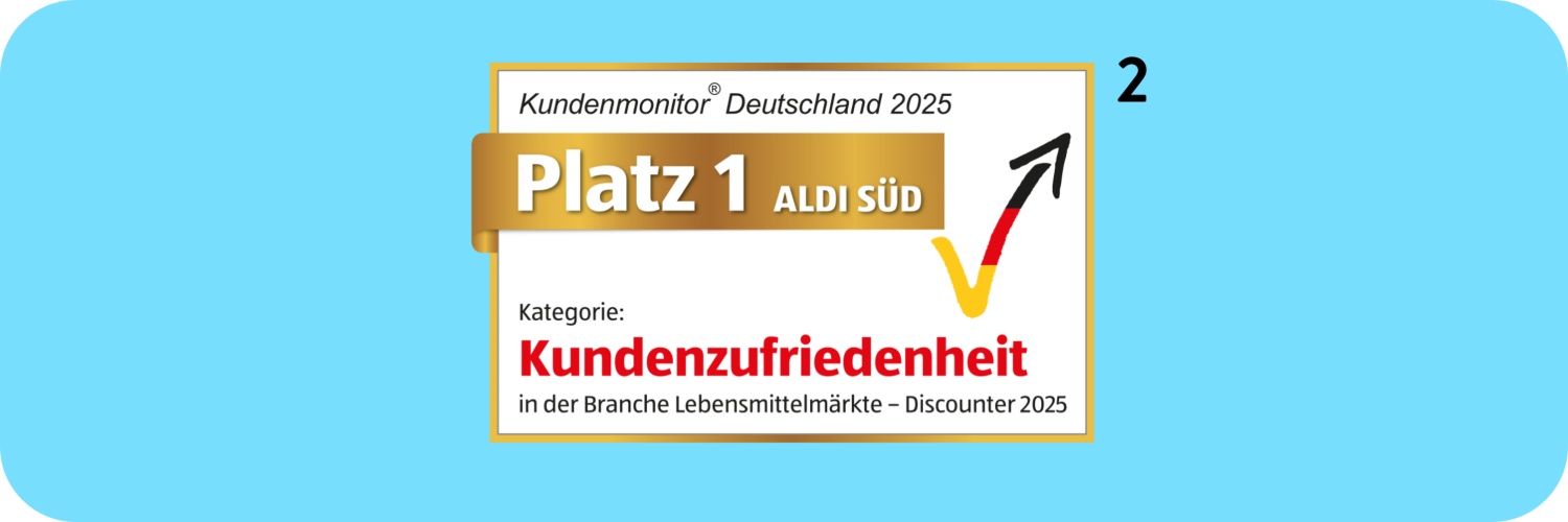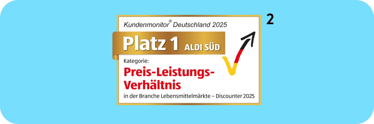 ² Auszeichnungen beziehen sich auf die Branche „Lebensmittelmärkte – Discounter“. Preise im Vergleich zum Wettbewerb. Quelle: Kundenmonitor ® Deutschland 2025 (www.kundenmonitor.de/25-026-2); ServiceBarometer AG, München.