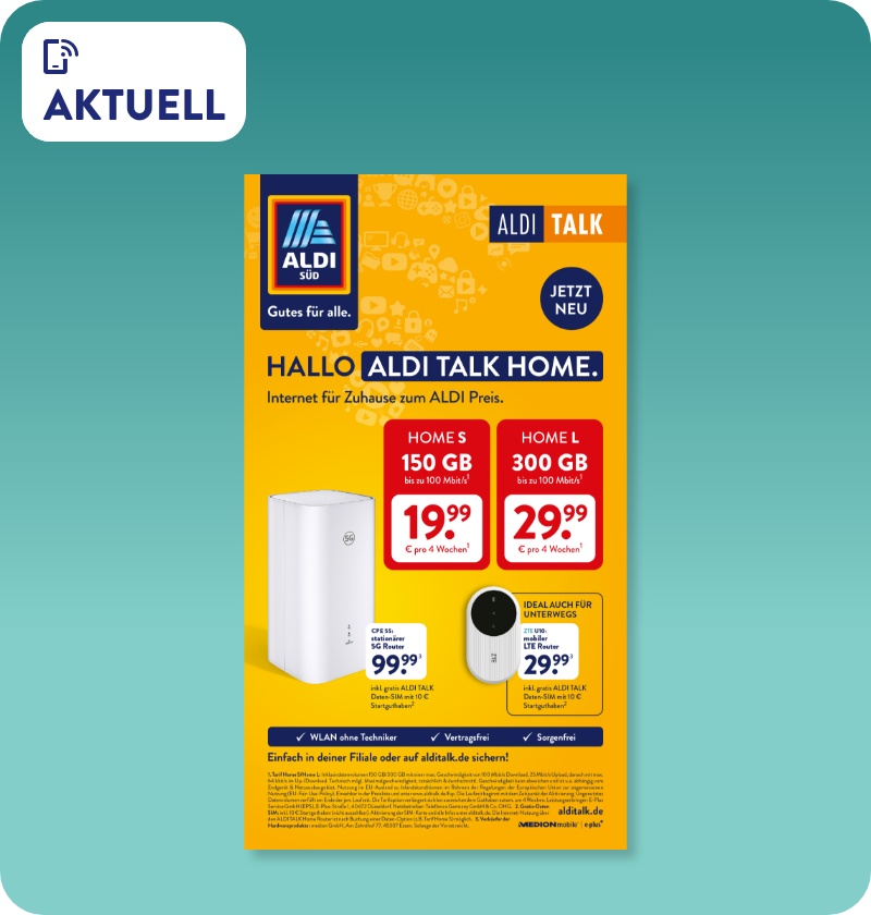 von ALDI TALK Routern ist nur mit einer gebuchten Datenoption (z.B. Home S) möglich. Aktivierung der SIM-Karte und alle Infos: alditalk.de.