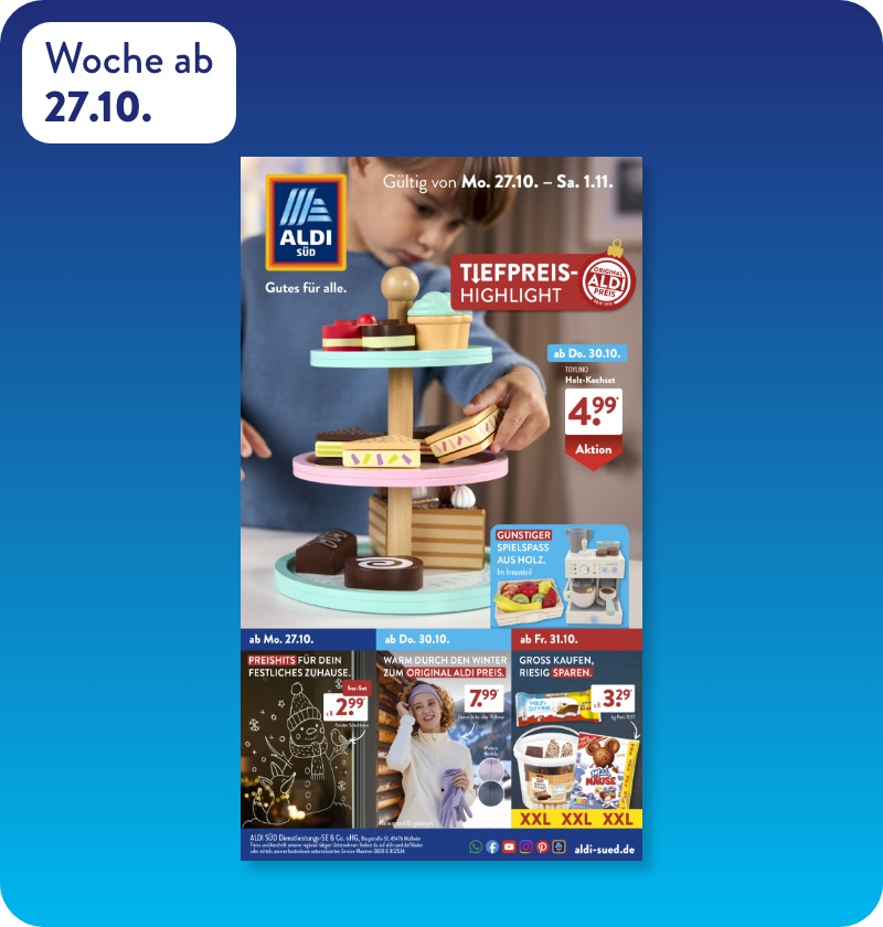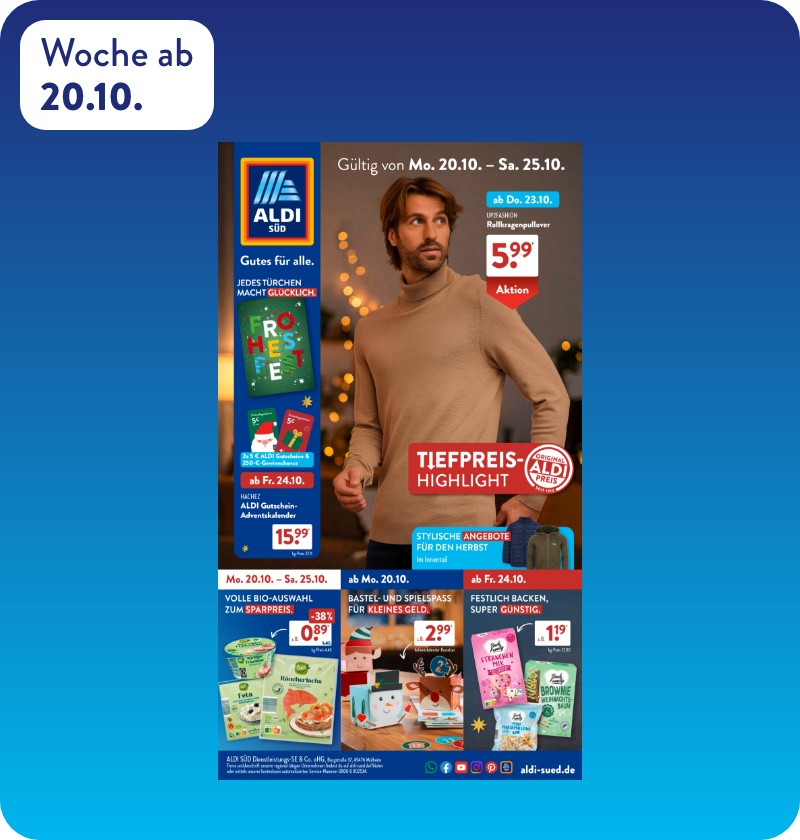 Bleib informiert und melde dich für unsere ALDI SÜD Kanäle an. Dort findest du die aktuellen Prospekte, Angebote, Gewinnspiele, Rezepte und vieles mehr.