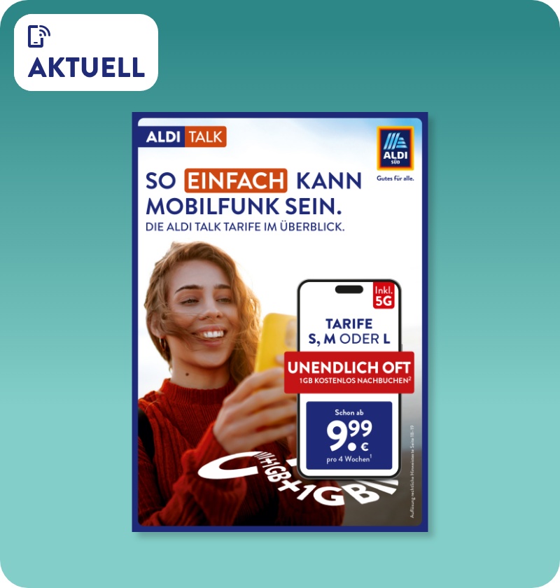 ¹ Tarif S 9,99 €/4 Wochen, Tarif M 14,99 €/4 Wochen, Tarif L 19,99 €/4 Wochen: Buchbar zum Basis-Tarif. Enthalten: Gespräche/SMS innerhalb DE (ohne Sondernr. u. Mehrwertdienste). Anfängliches Inklusivdatenvolumen: im Tarif S: 25 GB / im Tarif M: 50 GB / im Tarif L: 100 GB mit einer max. Geschwindigkeit von 50/100/150 Mbit/s im Download, 25 Mbit/s im Upload, danach mit max. 64 kbit/s im Up-/Download. Es handelt sich um die technisch mögliche Maximalgeschwindigkeit. Die tatsächlich & durchschnittlich erreichte Geschwindigkeit kann davon abweichen und ist u.a. abhängig vom Endgerät & Netzausbaugebiet. Im EU-Ausland ist die Nutzung zu Inlandskonditionen im Rahmen der Regelungen der Europäischen Union zur angemessenen Nutzung (EU-Fair-Use-Policy) möglich. Details zur EU-Fair-Use-Policy sind in der Preisliste und unter www.alditalk.de/fup einsehbar. Ungenutztes Datenvolumen verfällt am Ende der jew. Laufzeit. Die Laufzeit beginnt mit dem Zeitpunkt der Aktivierung. Die Tarifoption verlängert sich bei ausreichendem Guthaben autom. um 4 Wochen.