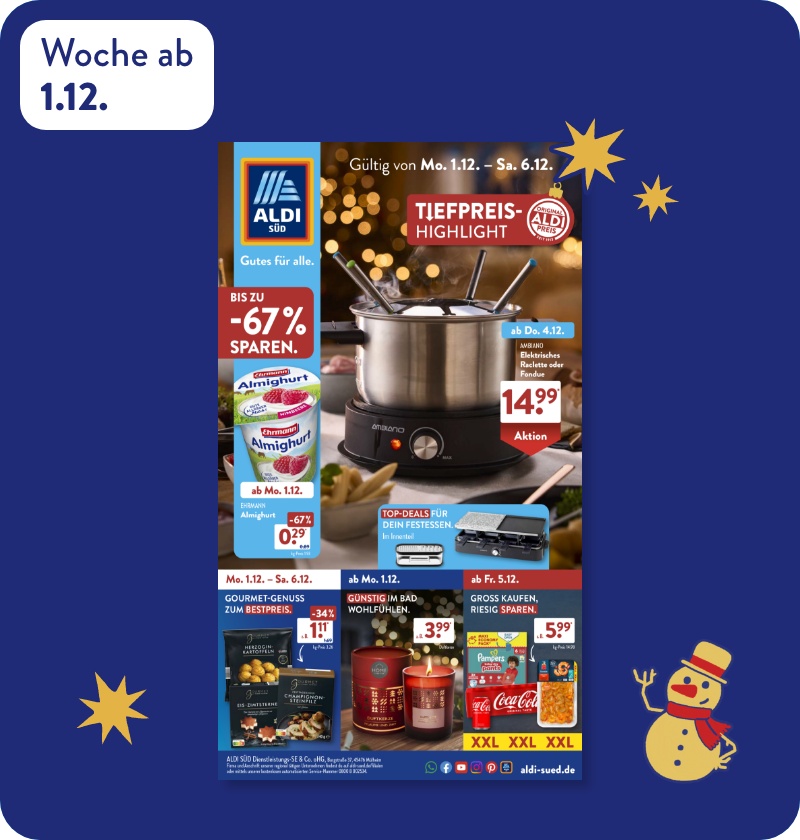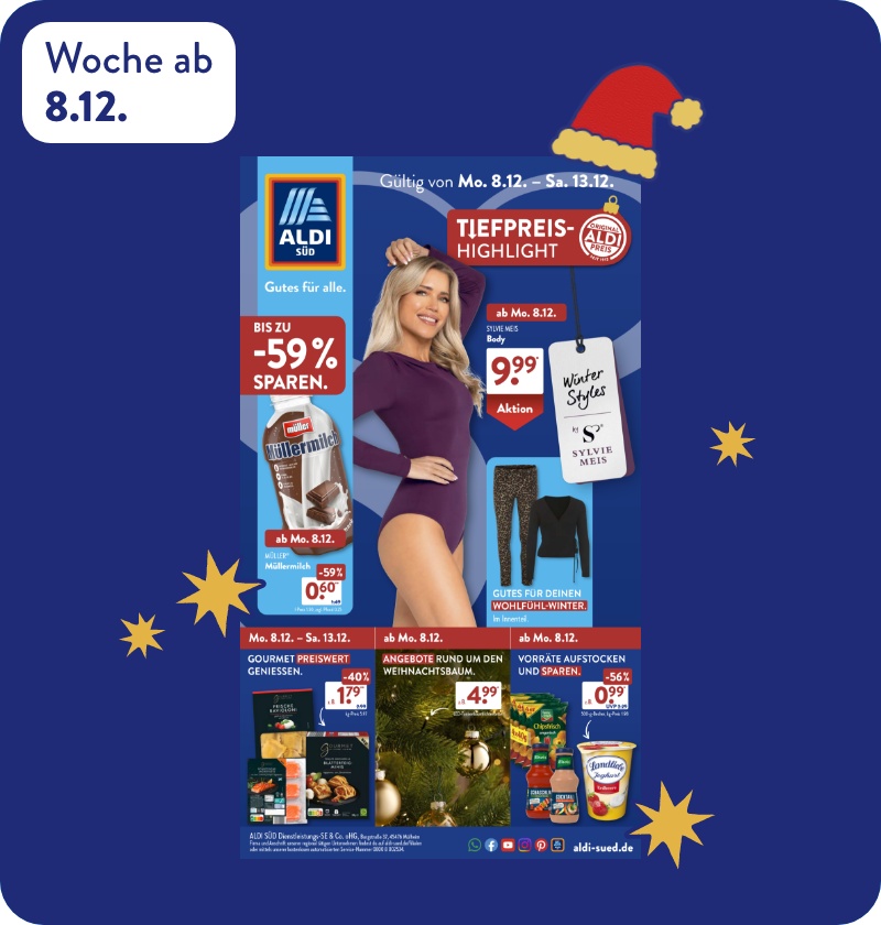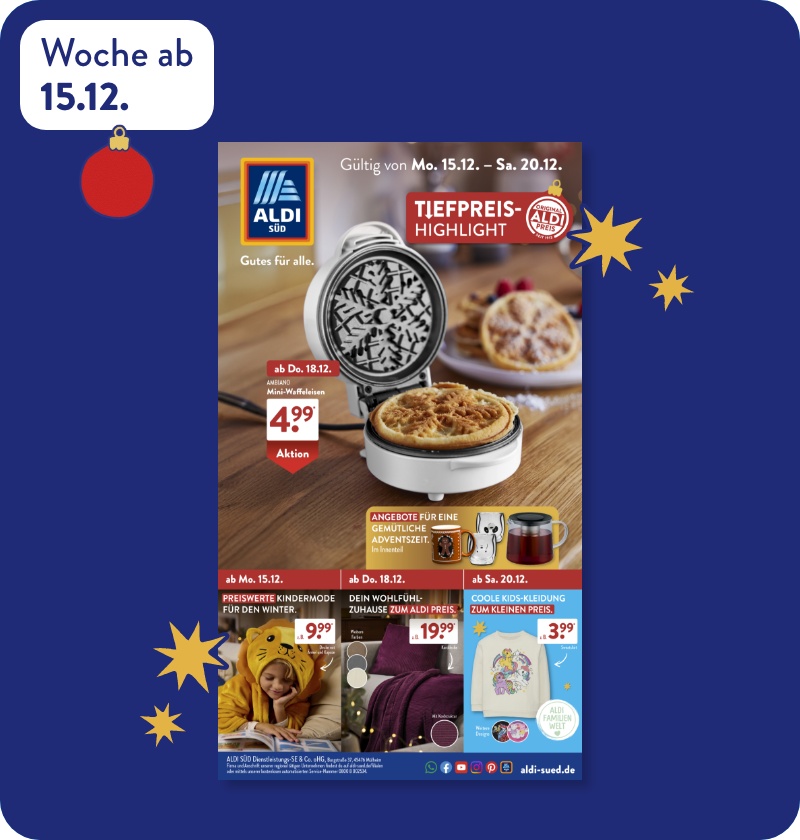 Bleib informiert und melde dich für unsere ALDI SÜD Kanäle an. Dort findest du die aktuellen Prospekte, Angebote, Gewinnspiele, Rezepte und vieles mehr.