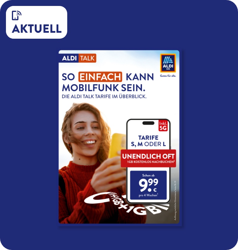 ¹ Tarif S 9,99 €/4 Wochen, Tarif M 14,99 €/4 Wochen, Tarif L 19,99 €/4 Wochen: Buchbar zum Basis-Tarif. Enthalten: Gespräche/SMS innerhalb DE (ohne Sondernr. u. Mehrwertdienste). Anfängliches Inklusivdatenvolumen: im Tarif S: 25 GB / im Tarif M: 50 GB / im Tarif L: 100 GB mit einer max. Geschwindigkeit von 50/100/150 Mbit/s im Download, 25 Mbit/s im Upload, danach mit max. 64 kbit/s im Up-/Download. Es handelt sich um die technisch mögliche Maximalgeschwindigkeit. Die tatsächlich & durchschnittlich erreichte Geschwindigkeit kann davon abweichen und ist u.a. abhängig vom Endgerät & Netzausbaugebiet. Im EU-Ausland ist die Nutzung zu Inlandskonditionen im Rahmen der Regelungen der Europäischen Union zur angemessenen Nutzung (EU-Fair-Use-Policy) möglich. Details zur EU-Fair-Use-Policy sind in der Preisliste und unter www.alditalk.de/fup einsehbar. Ungenutztes Datenvolumen verfällt am Ende der jew. Laufzeit. Die Laufzeit beginnt mit dem Zeitpunkt der Aktivierung. Die Tarifoption verlängert sich bei ausreichendem Guthaben autom. um 4 Wochen.