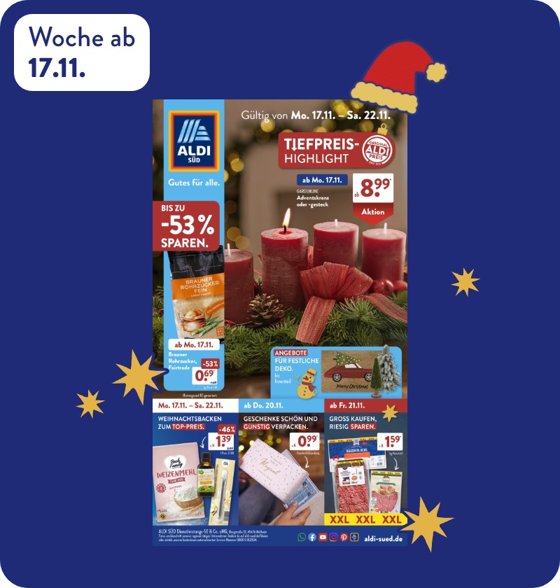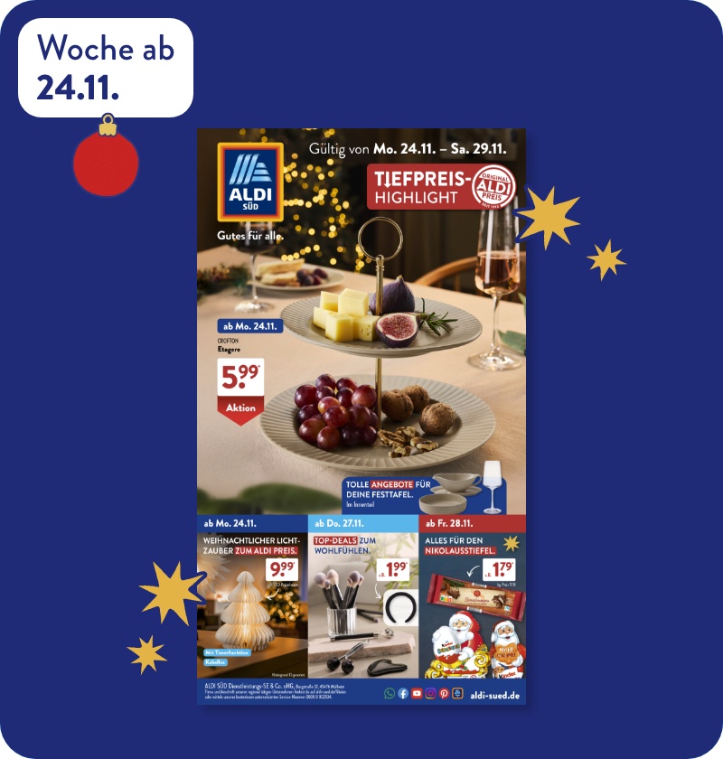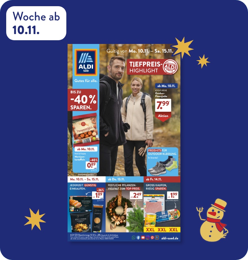 Bleib informiert und melde dich für unsere ALDI SÜD Kanäle an. Dort findest du die aktuellen Prospekte, Angebote, Gewinnspiele, Rezepte und vieles mehr.