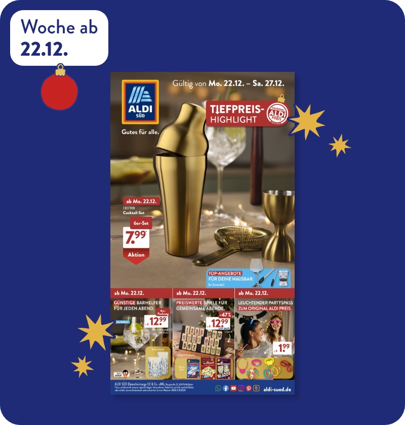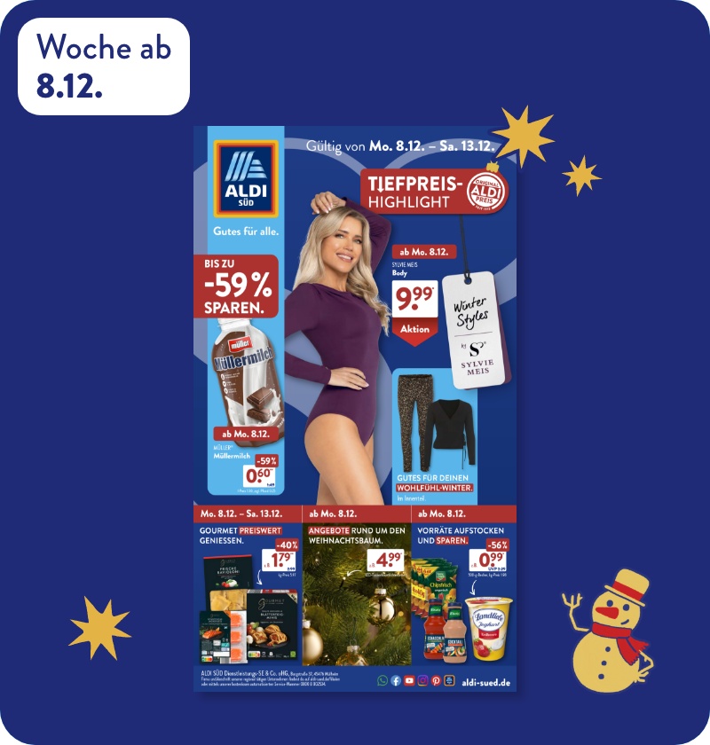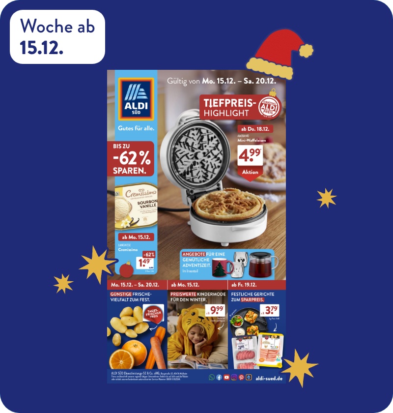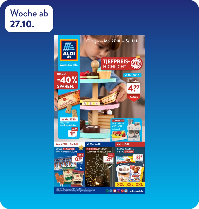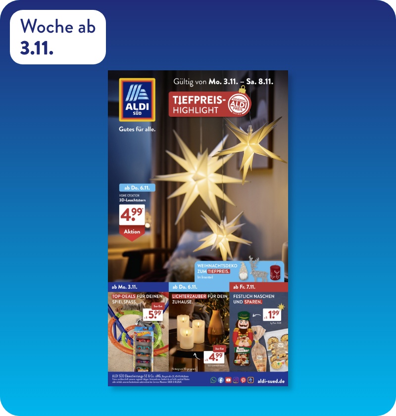 Bleib informiert und melde dich für unsere ALDI SÜD Kanäle an. Dort findest du die aktuellen Prospekte, Angebote, Gewinnspiele, Rezepte und vieles mehr.