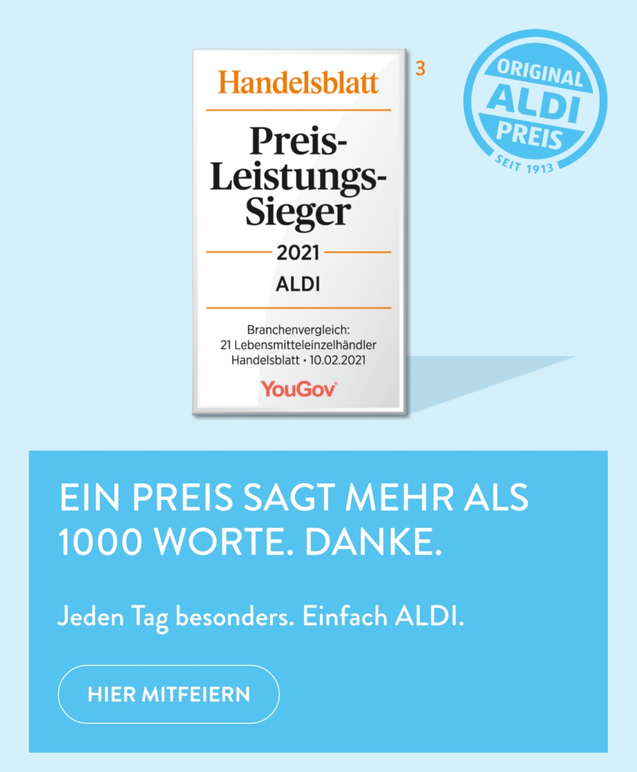 ⁴ Die Teilnahme ist im Gewinnspiel-Zeitraum vom 25.02.2021 bis 11.03.2021 möglich. Der Gewinner wird nach Ablauf des Gewinnspiels von ALDI SÜD informiert. Die Teilnahme ist ab 18 Jahren möglich. Die Gewinner werden per Los ermittelt. Eine Barauszahlung ist nicht möglich. Weitere Infos zum Gewinnspiel findest du hier.