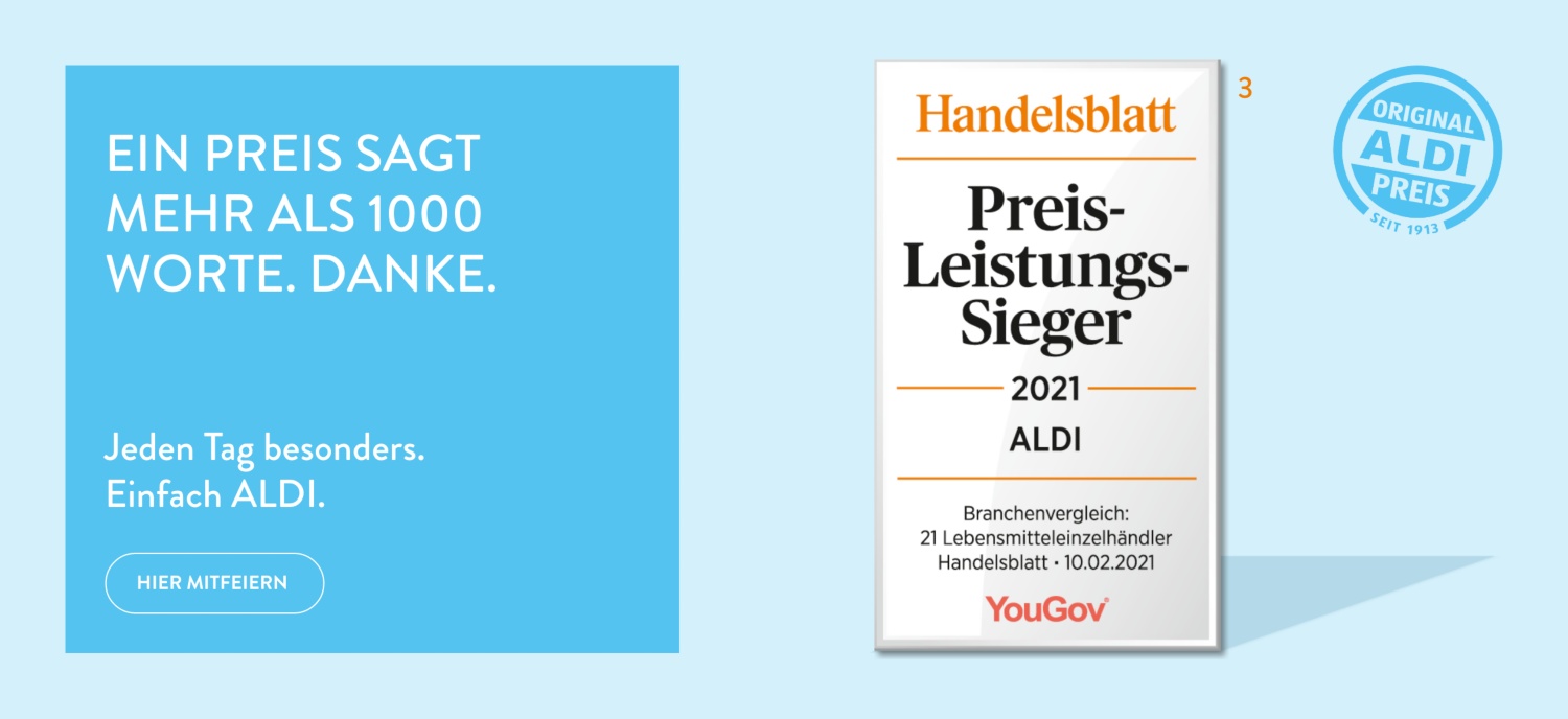 ³ Die Marke ALDI steht nach Ansicht der von YouGov befragten Verbrauchern für das beste Preis-Leistungs-Verhältnis in der Kategorie Lebensmittel. Mehr Informationen auf www.handelsblatt.com/preis-leistungs-verhaeltnis