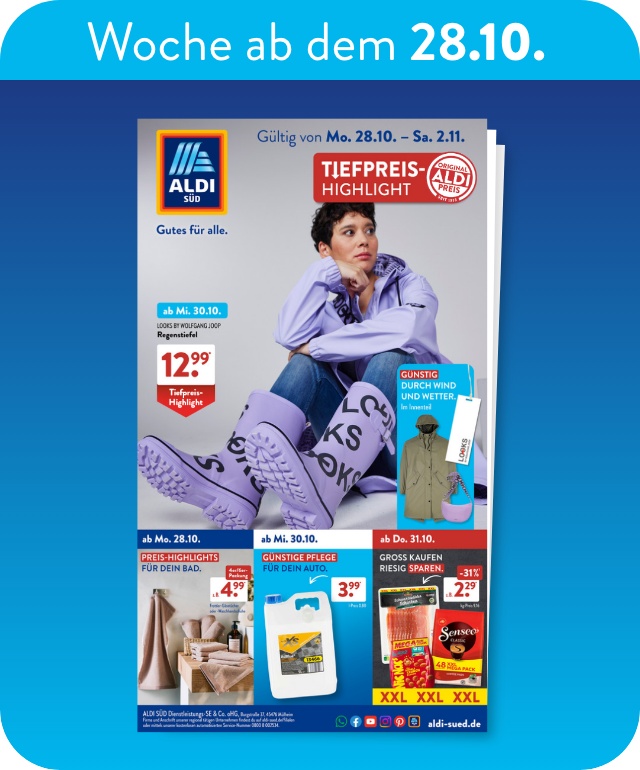 4 Teilnahmebedingungen: Teilnahmezeitraum: 1.10. - 7.10.23 (Teilnahme auf www.aldi-gluecksrad.de oder über die ALDI SÜD App) sowie 8.10. - 14.10.23, 15.10. - 21.10.23 und 22.10. - 31.10.23 (jeweils eine zusätzliche Teilnahme über die ALDI SÜD App). Teilnahmeberechtigt sind alle volljährigen Personen mit Wohnsitz in Deutschland. Die Teilnahme am Gewinnspiel erfordert die Registrierung für den ALDI SÜD Newsletter bzw. die Installation der ALDI SÜD App. Gewinner werden per Los ermittelt. Veranstalter der Aktion ist die ALDI SÜD Dienstleistungs- SE & Co. oHG, Burgstraße 37, 45476 Mülheim. Die vollständigen Teilnahmebedingungen wie auch Informationen zum Datenschutz und deinen Betroffenenrechten findest du auf www.aldi-gluecksrad.de. Irrtümer und Druckfehler vorbehalten.