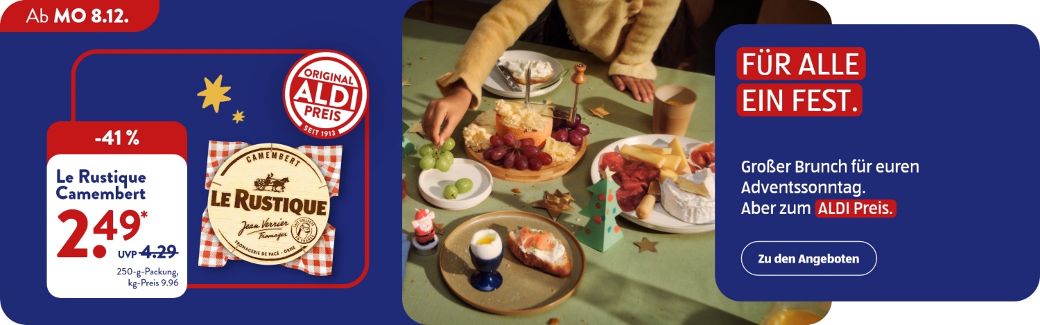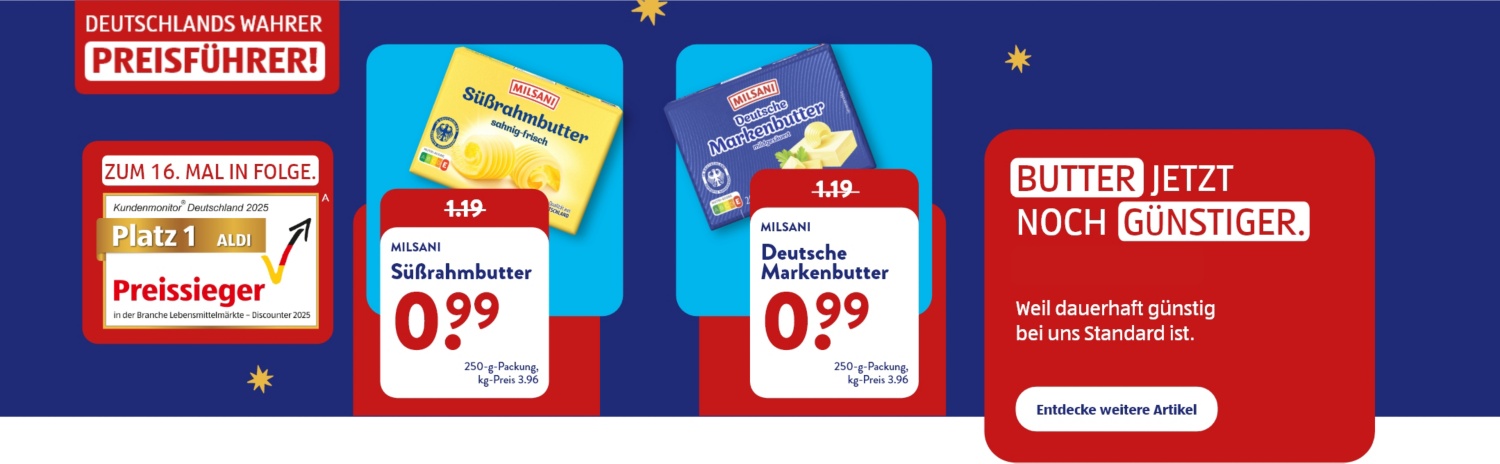 A Auszeichnungen beziehen sich auf die Branche „Lebensmittelmärkte – Discounter“. Quelle: Kundenmonitor® Deutschland 2025 (www.kundenmonitor.de/25-026-2); ServiceBarometer AG, München. ALDI SÜD Dienstleistungs-SE & Co. oHG, Burgstraße 37, 45476 Mülheim, Firma und Anschrift unserer regional tätigen Unternehmen findest du auf aldi-sued.de/filialen oder mittels unserer kostenlosen automatisierten Service-Nummer 08008002534.