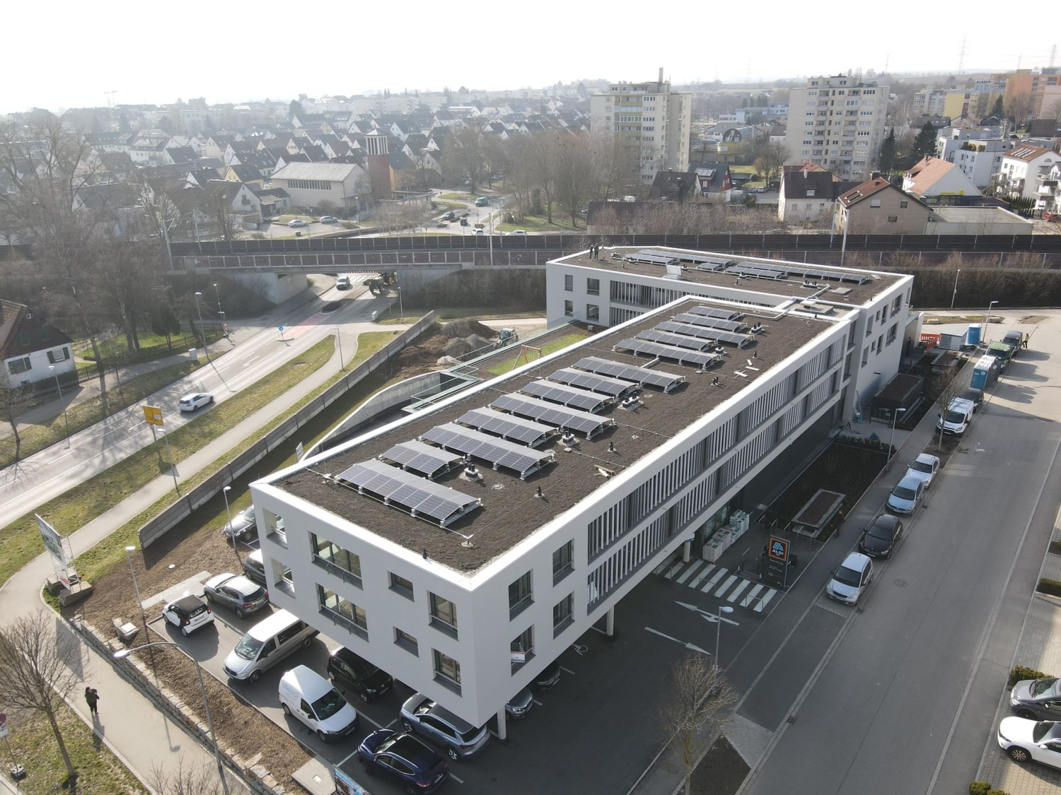 Das Gebäude auf dem 3.400 m2 großen Grundstück umfasst eine Tiefgarage (2.250 m2) mit 52 PKW-Stellplätzen für Kunden sowie – separiert davon – 24 Stellplätze für Bewohner. Im Erdgeschoss befinden sich eine ALDI SÜD Filiale (800 m2 Verkaufsfläche), 16 PKW-Stellplätze für Kunden, 64 Stellplätze für Fahrräder sowie zwei Vorrichtungen für E-Ladestationen. Im ersten und zweiten Obergeschoss wurden 24 Wohnungen in einer Größe von 52 bis 75 m2 realisiert, davon sind fünf sozial gefördert. Alle Wohnungen sind voraussichtlich im März 2024 bezugsfertig. Auf der Filiale befindet sich ein knapp 60 m2 großer Spielplatz, auf dem Gebäudedach wurde eine Photovoltaikanlage installiert. Geheizt wird mit Fernwärme.
