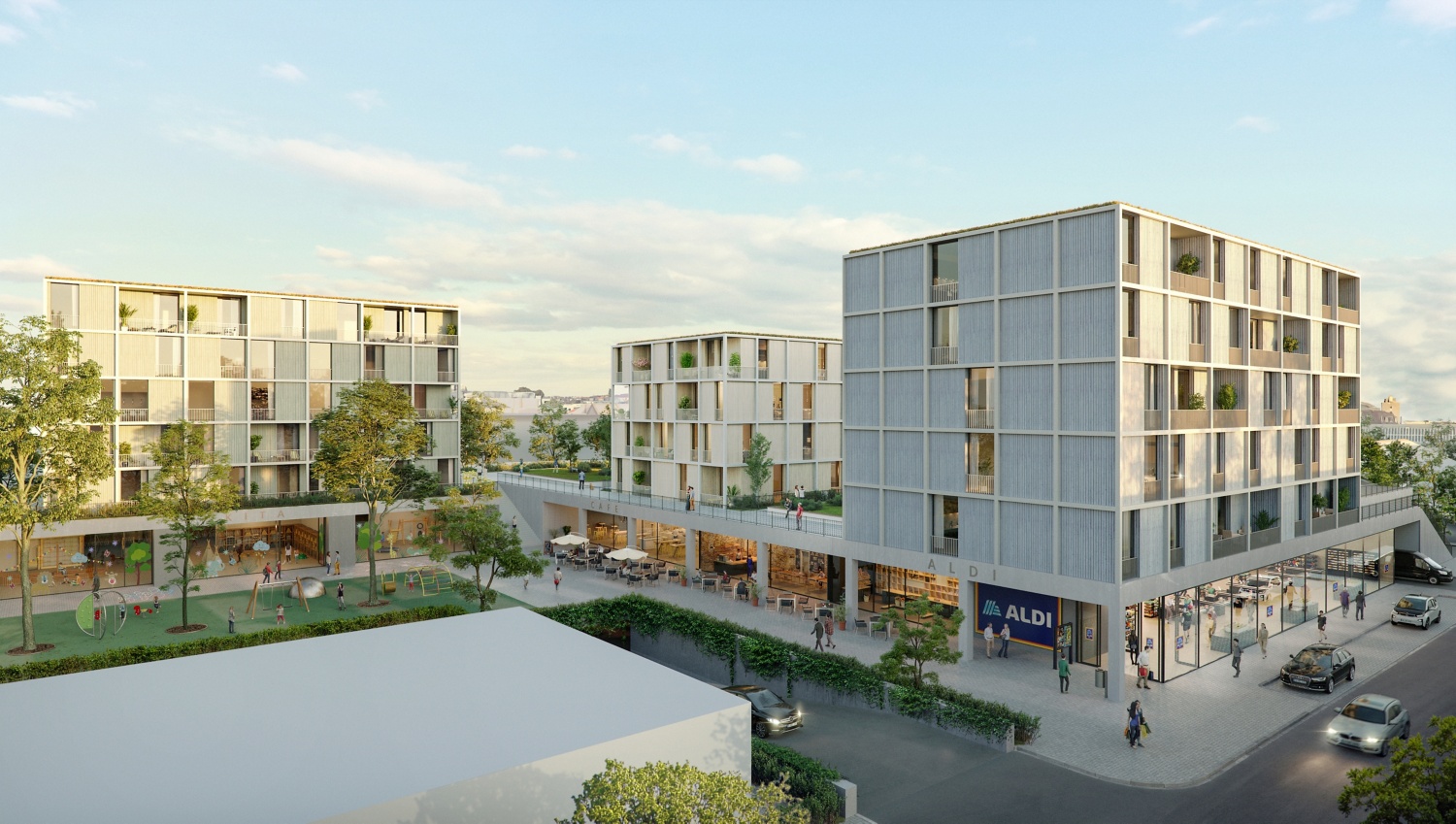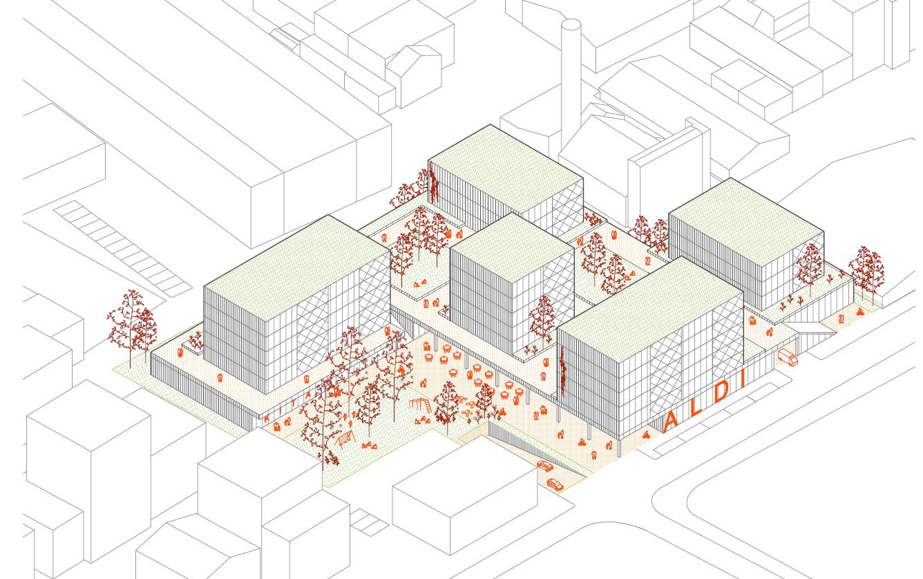 Einen hohen Stellenwert hat in dem Projekt das Thema ökologische Nachhaltigkeit: Wir planen unter anderem umfangreiche Grünanlagen, eine insektenfreundliche Dachbegrünung, Photovoltaikanlagen, modernste Haustechnik mit Wärmerückgewinnung und eine holzhybride Bauweise. Abrunden soll das Projekt eine Quartiersgarage im Untergeschoss. Hier können rund 180 großzügig dimensionierte Komfortstellplätze einschließlich einer Mobilitätsstation mit Elektroladestationen untergebracht werden. Sie sollen sowohl Kunden von ALDI SÜD wie auch der Nachbarschaft zur Verfügung stehen. Wer mit dem Fahrrad kommt, findet neben üppigen Abstellplätzen auch eine Reparaturstation vor.