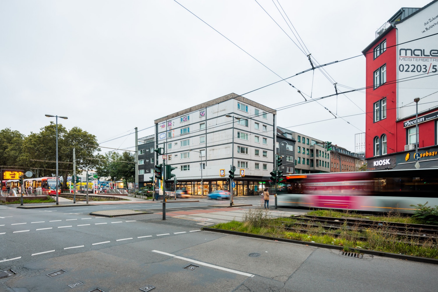 Die Kreuzung an der Venloer Straße, Ecke Ehrenfeldgürtel ist einer der höchstfrequentierten Orte in Köln. Ober- und unterirdische Bahnlinien kreuzen, Busse halten, und der S-Bahnhof ist gleich nebenan. Nicht nur tagsüber strömen hier die Menschen zwischen vielfältigem Einzelhandel, Cafés und Clubs, Schulen und Büros. ALDI SÜD ist hier sehr nah an seinen Kundinnen und Kunden, die ihren Einkauf so problemlos mit Alltagsroutinen verbinden können. Pkw-Stellplätze sind hier nicht nötig und entsprechend nicht vorhanden.