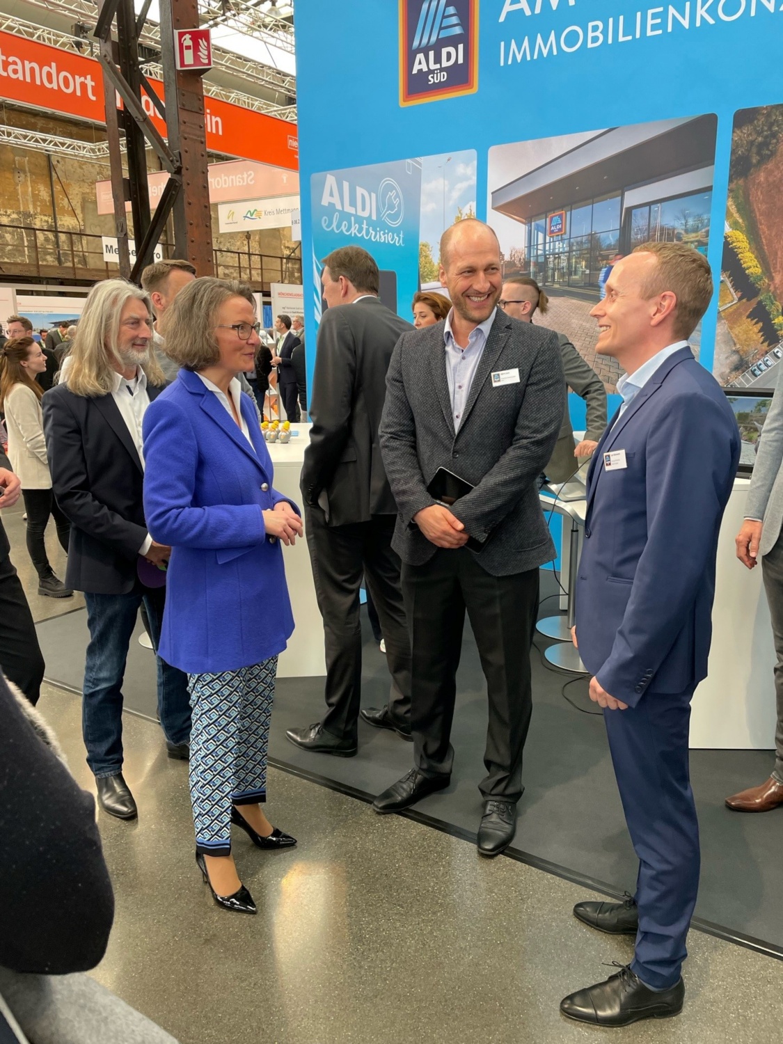 Beim anschließenden Besuch des ALDI SÜD Stands erkundigte sie sich, wie der Discounter dazu beitragen kann, Flächen in Innenstädten effizienter zu nutzen – beispielsweise mit zusätzlichem Wohnraum. Am Beispiel der aktuellen Projektentwicklungen „Grüne Höfe“ in Köln und den „Zooterrassen“ in Düsseldorf ließ sich die Ministerin erläutern, wie Quartiersentwicklungen von ALDI SÜD lokale Infrastruktur in Zukunft stärken und aufwerten können. Dazu gehören auch die Installation von E-Ladestationen und Photovoltaikanlagen, die an Filialstandorten einen ergänzenden Beitrag zum nachhaltigen Umgang mit Ressourcen leisten.