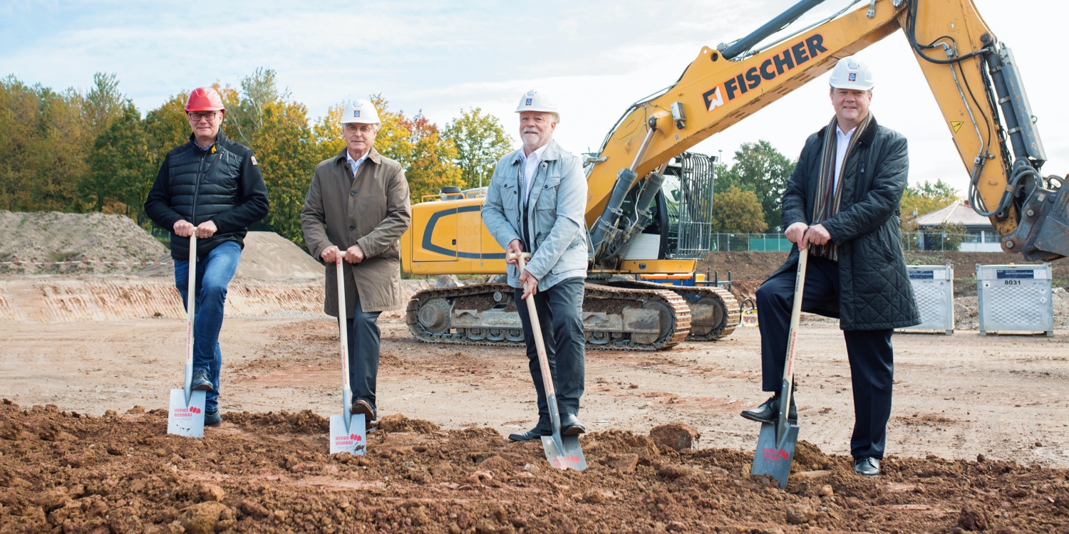 Die Bauarbeiten am neuen Nahversorgungszentrum in der Waldbronner Talstraße haben offiziell begonnen. Den symbolischen ersten Spatenstich erledigten Bürgermeister Franz Masino sowie Vertreter der Werner Wohnbau GmbH und ALDI SÜD gemeinsam.
