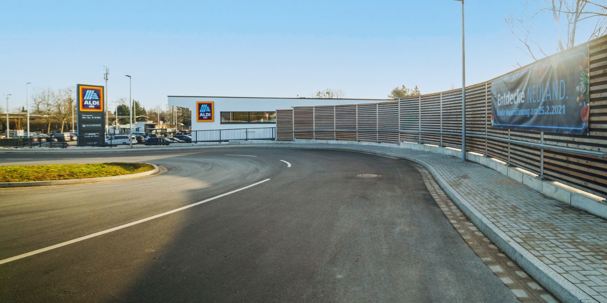 Um den Verkehr der Straße „An den Linden“ in Richtung S-Bahnhof zu entlasten, baute ALDI SÜD eine neue Erschließungsstraße mit eigener Abbiegerspur. Die alte Zufahrtstraße, an der unter anderem ein Kindergarten und die örtliche Pfarrgemeinde liegen, ist nun verkehrsberuhigt.