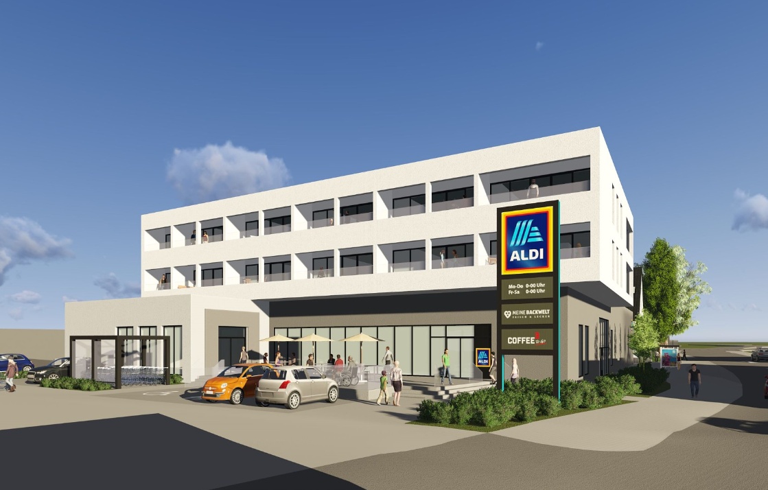 Dort ist der Bau einer Mixed-Use-Immobilie bereits in vollem Gang. Herzstück ist eine ALDI SÜD Filiale mit 1135 Quadratmetern Verkaufsfläche. Darunter liegt eine Tiefgarage mit 47 Stellplätzen. Obern drauf kommen außerdem 17 Wohnungen, die zwischen 55 und knapp 100 Quadratmeter groß sind. Eine besondere Herausforderung bei der Entwicklung des innerstädtischen Standorts waren die baurechtlichen Rahmenbedingungen – genauer: die Erhaltungssatzung für ein Gebäude auf dem Baugrundstück.