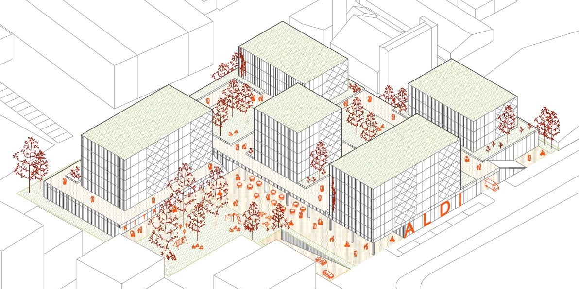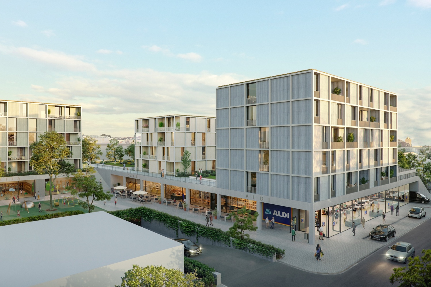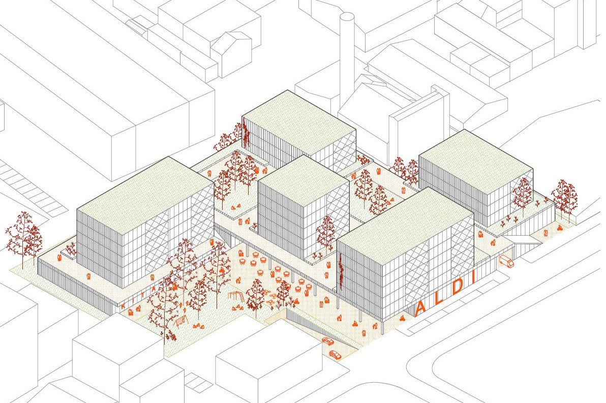 Einen hohen Stellenwert hat in dem Projekt das Thema ökologische Nachhaltigkeit: Wir planen unter anderem umfangreiche Grünanlagen, eine insektenfreundliche Dachbegrünung, Photovoltaikanlagen, modernste Haustechnik mit Wärmerückgewinnung und eine holzhybride Bauweise. Abrunden soll das Projekt eine Quartiersgarage im Untergeschoss. Hier können rund 180 großzügig dimensionierte Komfortstellplätze einschließlich einer Mobilitätsstation mit Elektroladestationen untergebracht werden. Sie sollen sowohl Kunden von ALDI SÜD wie auch der Nachbarschaft zur Verfügung stehen. Wer mit dem Fahrrad kommt, findet neben üppigen Abstellplätzen auch eine Reparaturstation vor.