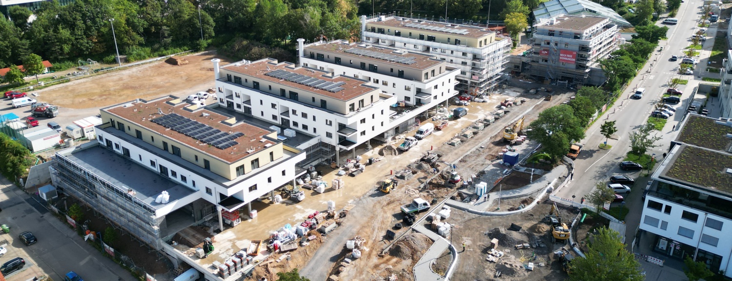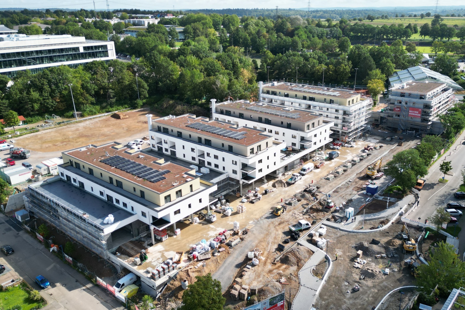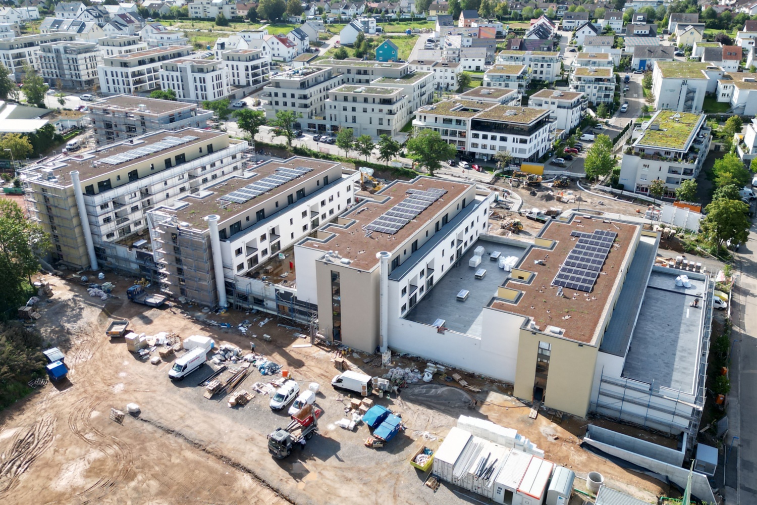 Auf insgesamt 12.000 Quadratmetern entstehen im Erdgeschoss zusätzliche Handelsflächen für einen Rewe- und einen dm-Markt. In insgesamt fünf mehrgeschossigen Aufbauten werden 115 Wohnungen eingerichtet, von denen 20 Prozent sozial gefördert sind. „Das Bauprojekt stärkt unseren Ortskern“, hatte Waldbronns Bürgermeister Franz Masino zum offiziellen Spatenstich unterstrichen. „Es verbessert die Nahversorgung und erleichtert das Einkaufen auf kurzen Wegen − und mit weniger CO2-Ausstoß. Außerdem gewinnen wir Wohnraum, ohne dafür zusätzliche Flächen zu verdichten.“