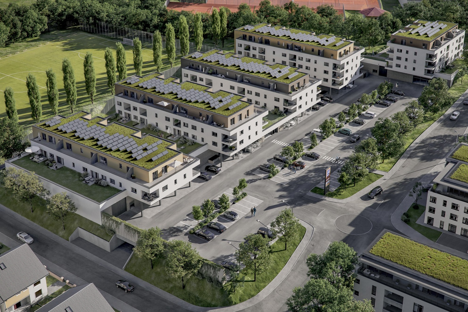 So ließen sich unterschiedliche Ansprüche berücksichtigen und auch kritische Stimmen zu nutzen, um dem Bauprojekt vor Ort Akzeptanz und Anerkennung zu verschaffen. So wurde die Höhe des Objekts stärker an die der umliegenden Häuser angepasst und die Anzahl der Wohnungen reduziert, um den Bau städtebaulich besser zu integrieren. Das Wohn- und Geschäftshaus wird außerdem als nachhaltiges Objekt geplant und mit einem begrünten Dach sowie Solarthermie ausgestattet.
