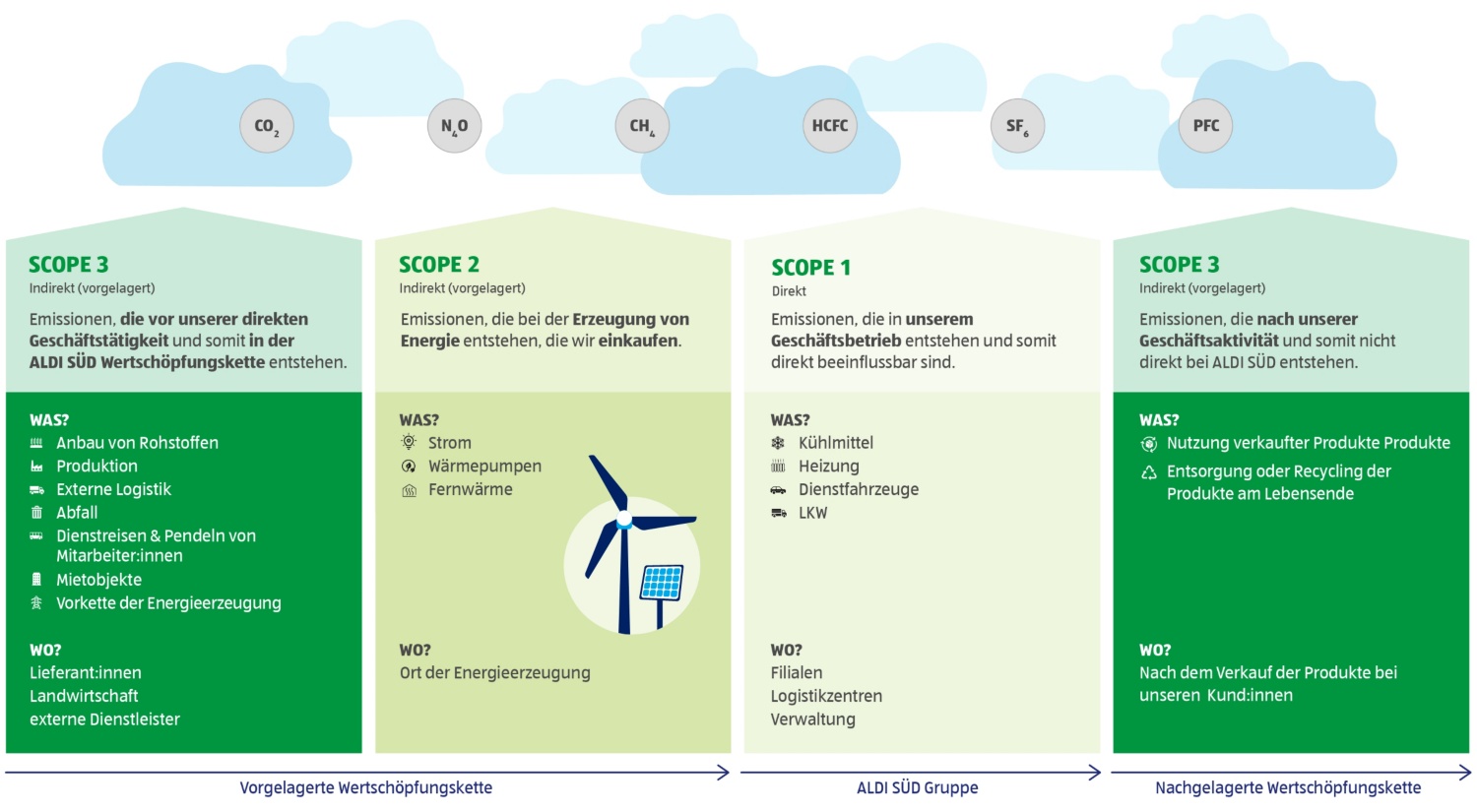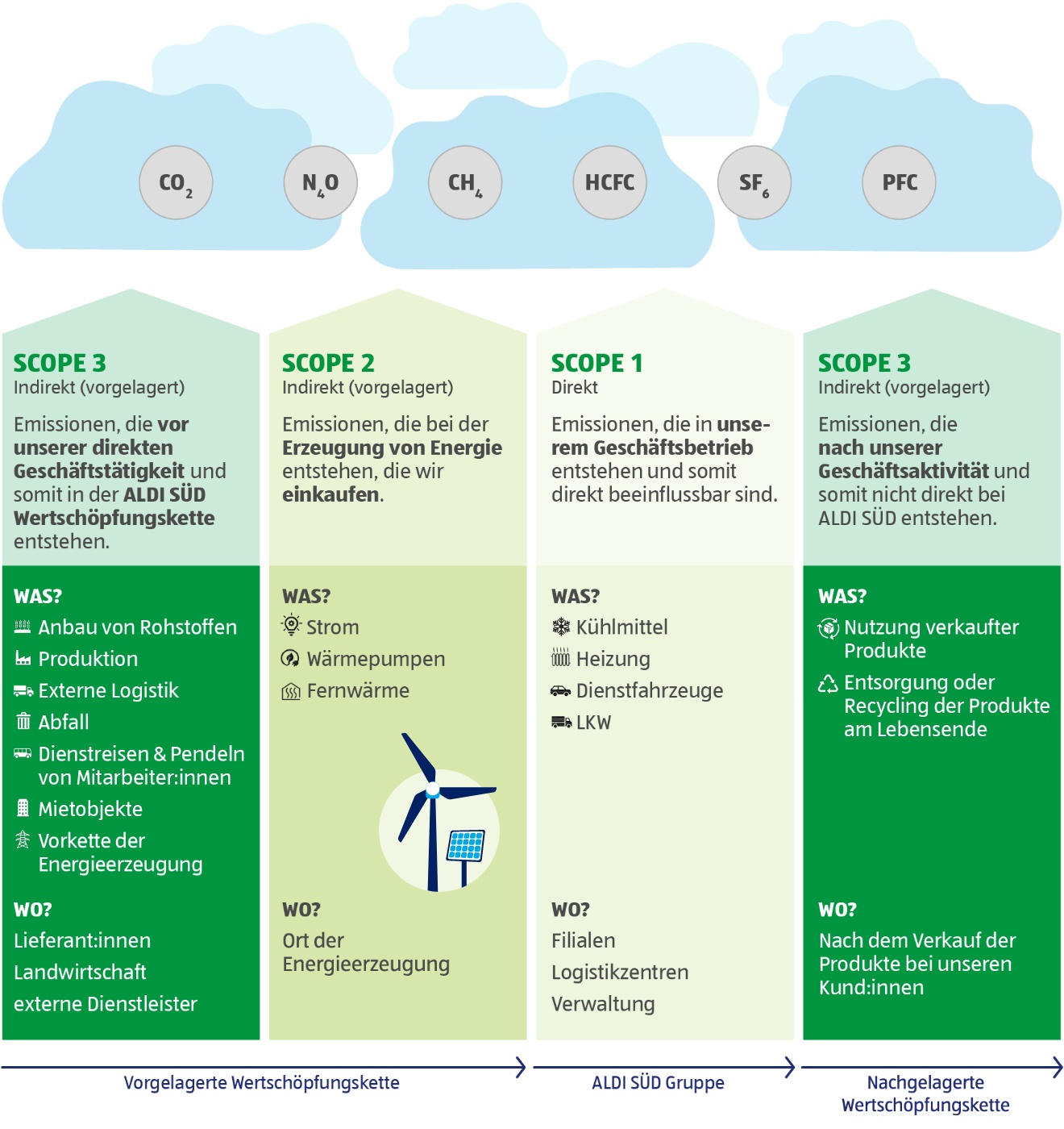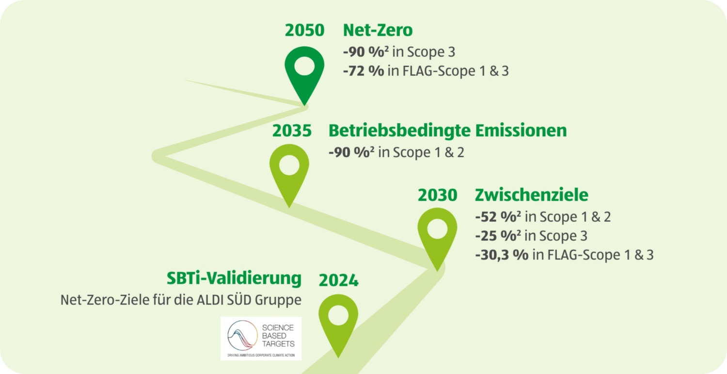 1 -90 % in Scope 1 & 2 im Vergleich zum Basisjahr 2021 bis 2035 und -90 % in Scope 3 im Vergleich zum Basisjahr 2022 bis 2050 bezogen auf die ALDI SÜD Gruppe. Umfasst betriebsbedingte und produktbezogene Treibhausgasemissionen sowie Emissionen aus Forstwirtschaft, Landnutzung und Landwirtschaft (Scope 1–3 und FLAG-Emissionen).