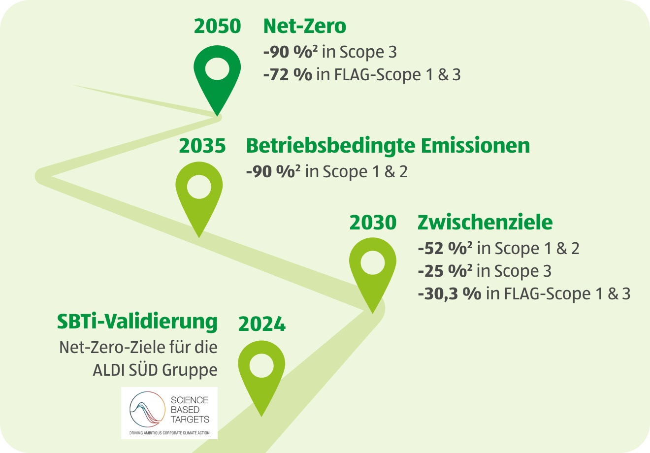 Wir bei ALDI SÜD sind uns bewusst, dass unsere Geschäftsaktivitäten einen erheblichen Einfluss auf das Klima und die Umwelt haben. Aus diesem Grund arbeiten wir als gesamte Unternehmensgruppe ALDI SÜD daran, die Treibhausgasemissionen in unseren eigenen Betrieben und entlang unserer Lieferketten zu reduzieren und Net-Zero („Nullemission“) gem. der Science Based Targets initative (SBTi) zu erreichen.