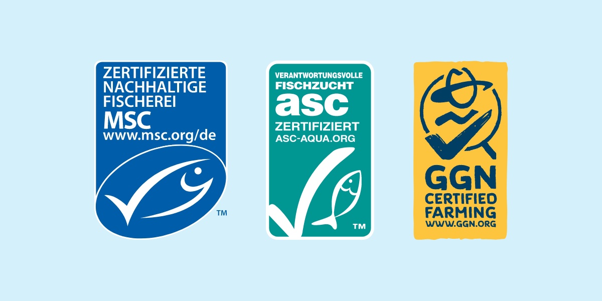 In unseren Filialen findest du MSC, ASC und GNN zertifizierte Produkte. So kennzeichnet zum Beispiel das MSC-Siegel Wildfisch-Fischereien, die das Ökosystem Meer schonen und keine überfischten Bestände befischen. Fisch aus Aquakultur erkennst du entweder an dem grünen ASC-Siegel des Aquaculture Stewardship Councils oder an dem blauen GLOBALG.A.P. Siegel „Zertifizierte Aquakultur“. Du willst mehr über die  Siegel für zertifizierten Fisch und Meeresfrüchte bei ALDI SÜD wissen?