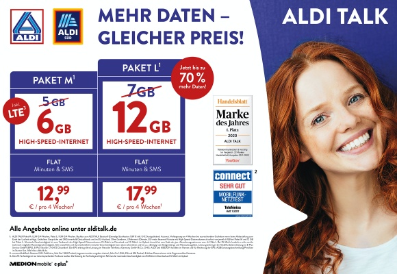 Mit dem Kombi-Paket L bekommen ALDI TALK Kunden zukünftig 12 GB statt bisher 7 GB – und damit rund 70 Prozent mehr High-Speed-Datenvolumen für gleichbleibend 17,99 Euro. Beim Kombi-Paket M sind es 6 GB statt bisher 5 GB Datenvolumen – und damit 20 Prozent mehr als bisher zum gleichen Preis von 12,99 Euro. Die beliebten ALDI TALK Kombi-Pakete beinhalten zudem eine All-Net-Flat für unbegrenzte SMS und mobile Telefonie ins deutsche Festnetz sowie in alle deutschen Mobilfunknetze. Die einzelnen Pakete sind jeweils für einen Zeitraum von vier Wochen gültig.