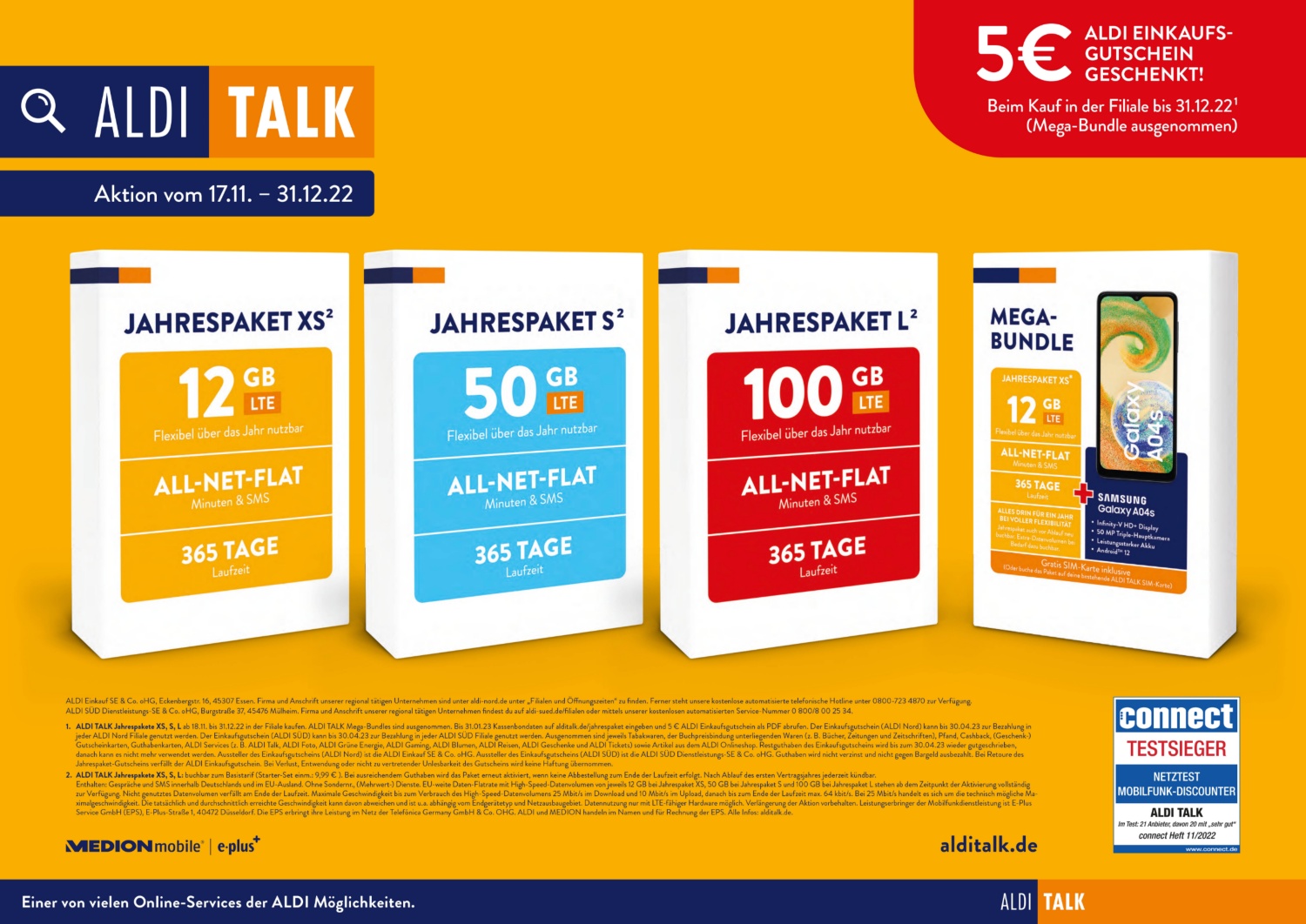 Zu jedem ALDI TALK Jahrespaket, das im Aktionszeitraum vom 17. November bis 31. Dezember 2022 in einer Filiale gekauft wird, gibt es außerdem einen 5,00 Euro ALDI Einkaufsgutschein geschenkt.3