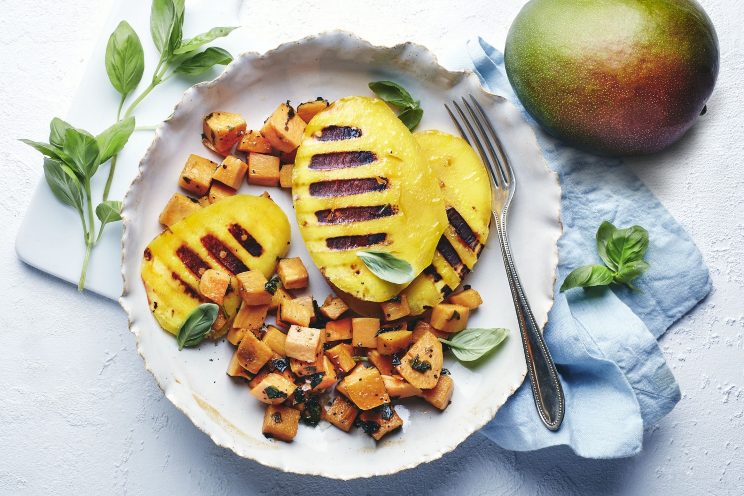 - Mango vom Grill mit gebratenen Süßkartoffeln