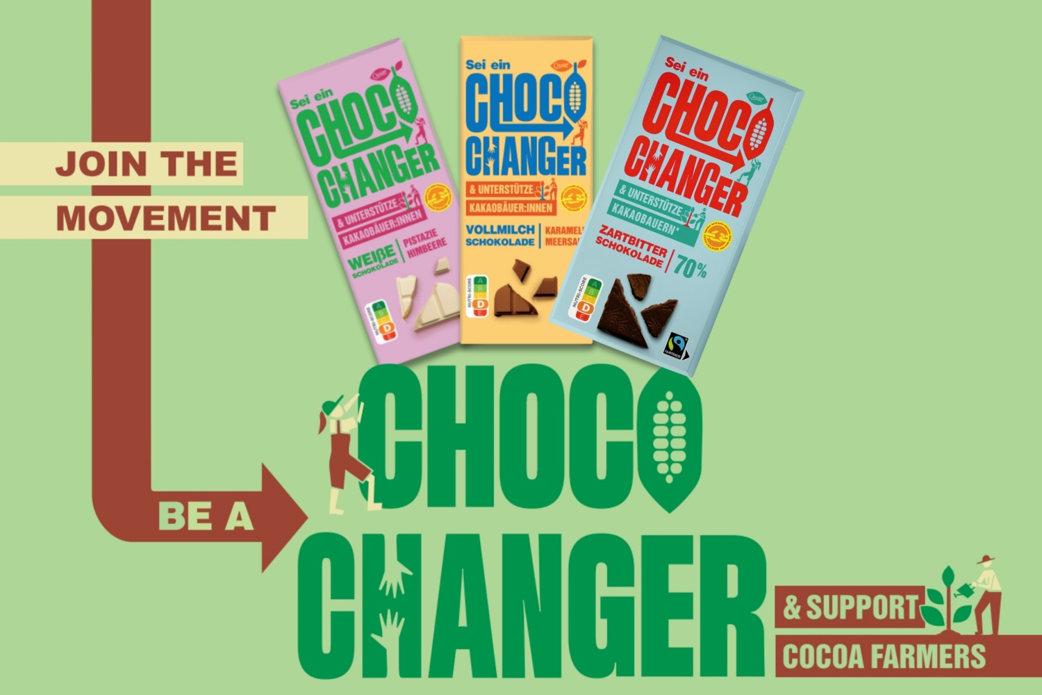 Unter der Eigenmarke CHOCEUR bietet ALDI SÜD bereits seit 2021 den CHOCO CHANGER an, der verantwortungsvoll produziert wird. Ab sofort glänzt der CHOCO CHANGER in einem neuen Look und verdeutlicht, dass er in den drei Sorten „Weiße Schokolade Pistazie Himbeere“, „Karamell Meersalz“ und „70 % Zartbitterschokolade“ nicht nur lecker, sondern auch nachhaltig ist.