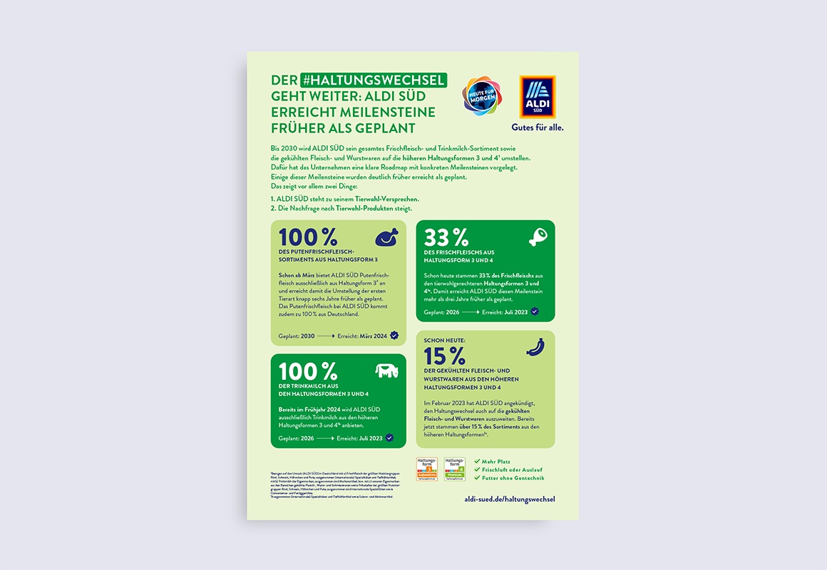 Mit der Umstellung des Putenfrischfleischs auf die höhere Haltungsform 3 erreicht ALDI SÜD einen weiteren wichtigen Meilenstein seines Tierwohlversprechens rund sechs Jahre früher als geplant. Dass die Umstellung bereits 2024 erfolgen kann, ist auf die enge Zusammenarbeit mit allen Akteur:innen der Lieferkette zurückzuführen, die von diesem Schritt zu mehr Tierwohl überzeugt sind. Zudem setzen die Kund:innen zunehmend auf Tierwohl-Produkte. Im Rahmen des #Haltungswechsels will das Unternehmen das gesamte Frischfleisch-Sortiment bis 2030 auf die höheren Haltungsformen 3 und 4 umstellen.