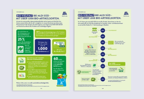 Bio hat bei ALDI SÜD eine lange Tradition: Bereits seit 2004 setzt der Discounter auf Lebensmittel in Bio-Qualität, das erste Bio-Produkt waren die Bio-Eier. Jetzt blickt der Discounter auf 20 Jahre Bio zurück und zeigt sein langjähriges Bio-Engagement. Unter dem Motto ,,ALDI feiert‘‘ stellt der Discounter auf verschiedenen Kanälen wie am POS, auf der Website und auf Social Media seine Bio-Vielfalt in den Vordergrund und lädt Kund:innen ein, die breite Bio-Palette zum besten Preis-Leistungs- Verhältnis bei ALDI SÜD zu entdecken.
