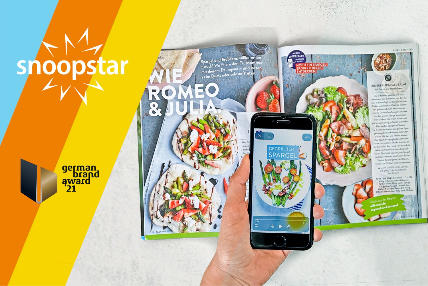 ALDI SÜD ist für sein innovatives Konzept der Kundenkommunikation mit dem German Brand Award 2021 in Gold ausgezeichnet worden. Seit Oktober 2020 verknüpft der Discounter mit der Augmented-Reality-Technologie-Plattform snoopstar digitale Inhalte mit dem gedruckten Handzettel. Verbraucherinnen und Verbraucher erhalten so virtuell vertiefende Informationen und Inspirationen.