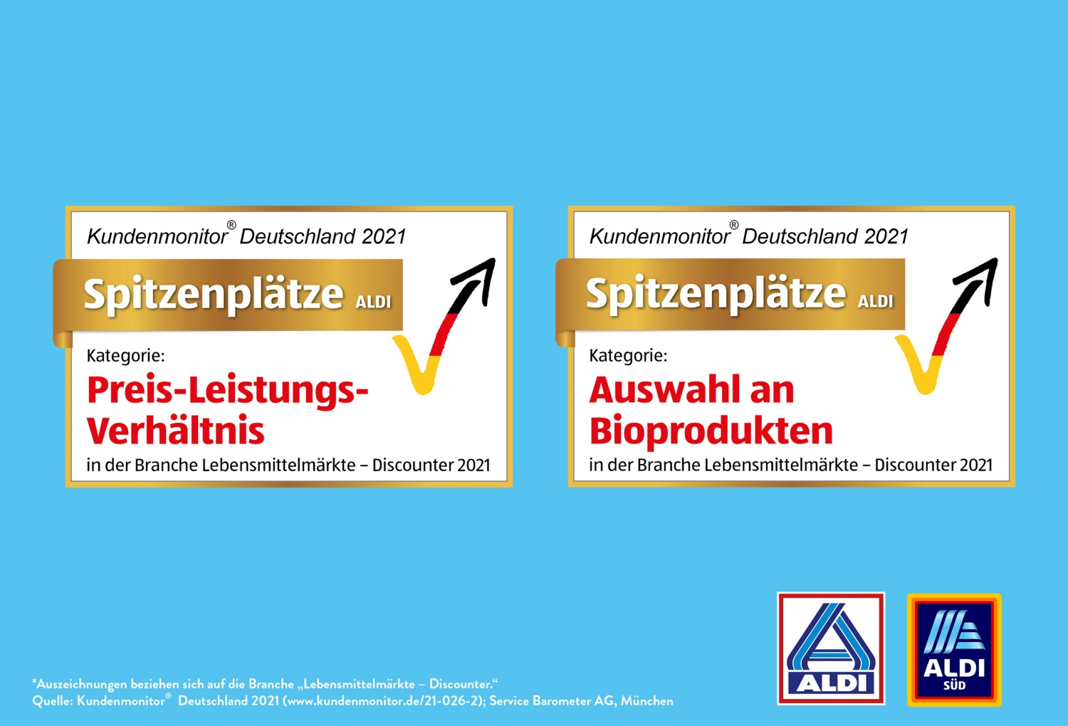 ALDI Nord und ALDI SÜD erzielen im aktuellen Branchenvergleich „Kundenmonitor Deutschland*“ zahlreiche Top-Platzierungen in der Sparte der Discounter − unter anderem beim „Preis-Leistungs-Verhältnis“ und der „Auswahl von Bioprodukten“.