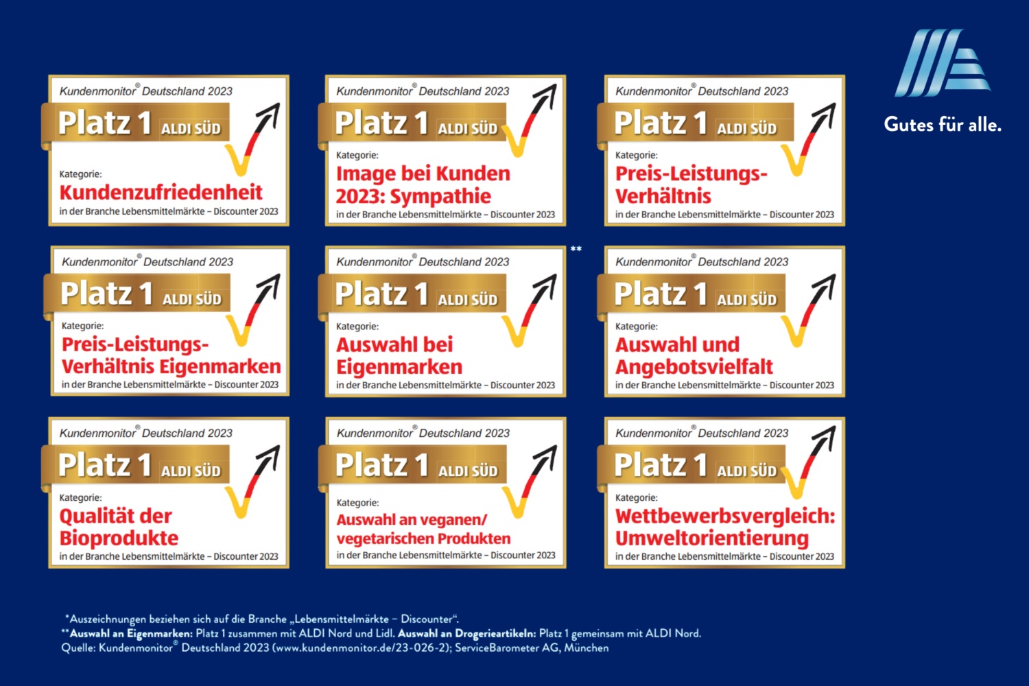 ALDI SÜD ist beim Kundenmonitor auch in diesem Jahr wieder unangefochten auf Platz eins. Vom Preis-Leistungs-Verhältnis über die Auswahl und Qualität der Bio-Produkte bis hin zur Zufriedenheit der Kund:innen: In insgesamt 27 Kategorien ist ALDI SÜD Spitzenreiter unter den Discountern.
