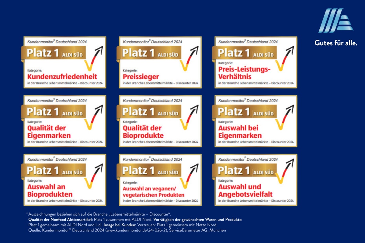 ALDI SÜD verteidigt 2024 den ersten Platz beim Kundenmonitor und bleibt unangefochten die Nummer Eins unter den Discountern. Mit unter anderem dem besten Preis-Leistungs-Verhältnis, der hohen Qualität der Eigenmarken sowie einer vielfältigen Auswahl an Bio-Produkten setzt ALDI SÜD Maßstäbe in insgesamt 24 Kategorien.1 Bereits zum 15. Mal in Folge wird ALDI SÜD gemeinsam mit ALDI Nord erneut als Preissieger unter den Discountern gekürt.