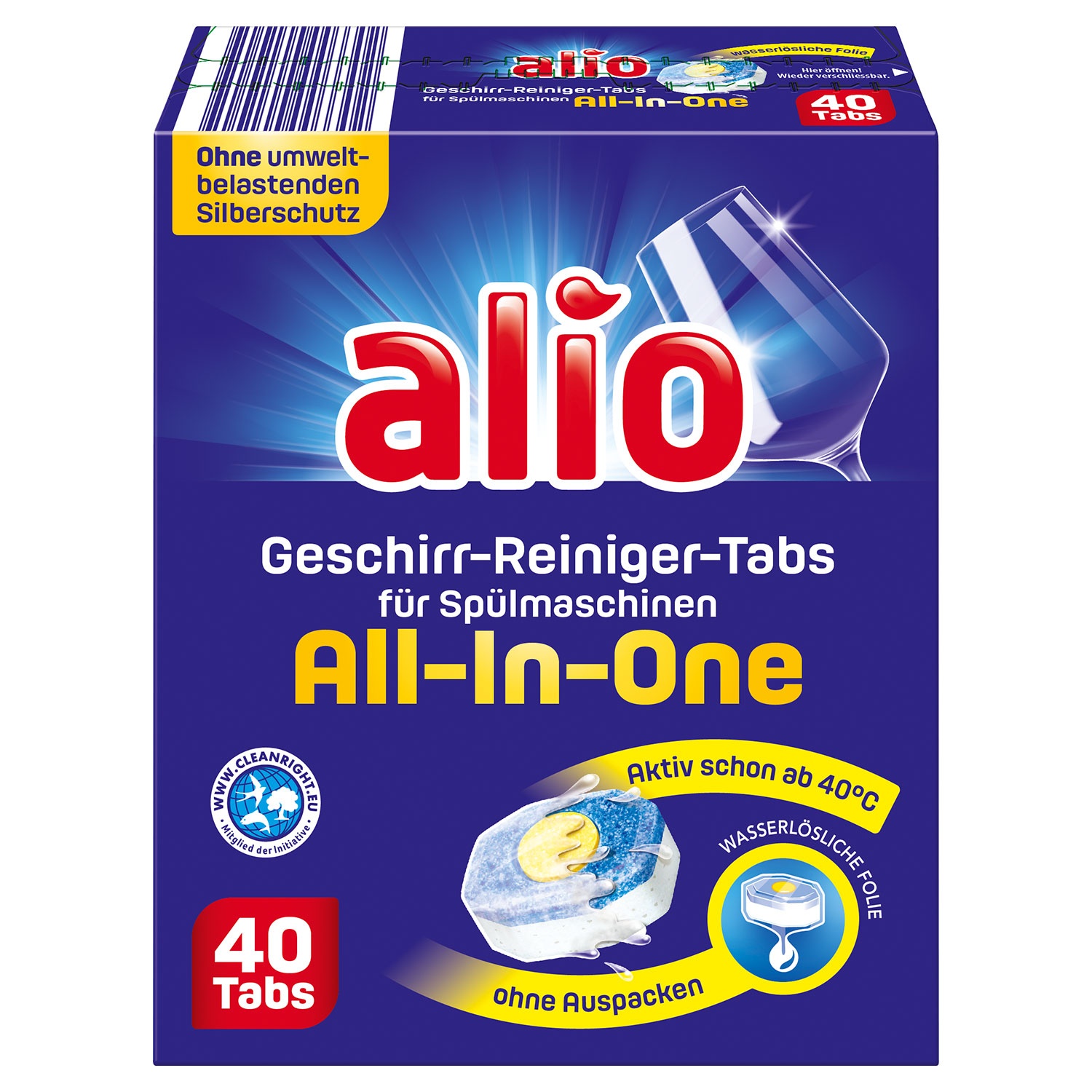 - Alio complete: Reiniger, Klarspüler, Salzfunktion, Glas- und Edelstahlschutz,Reinigungsverstärker, Trocken-Effekt, Direkt-Aktiv-Formel und Niedrig-Temperatur-System in einem Tab vereint
