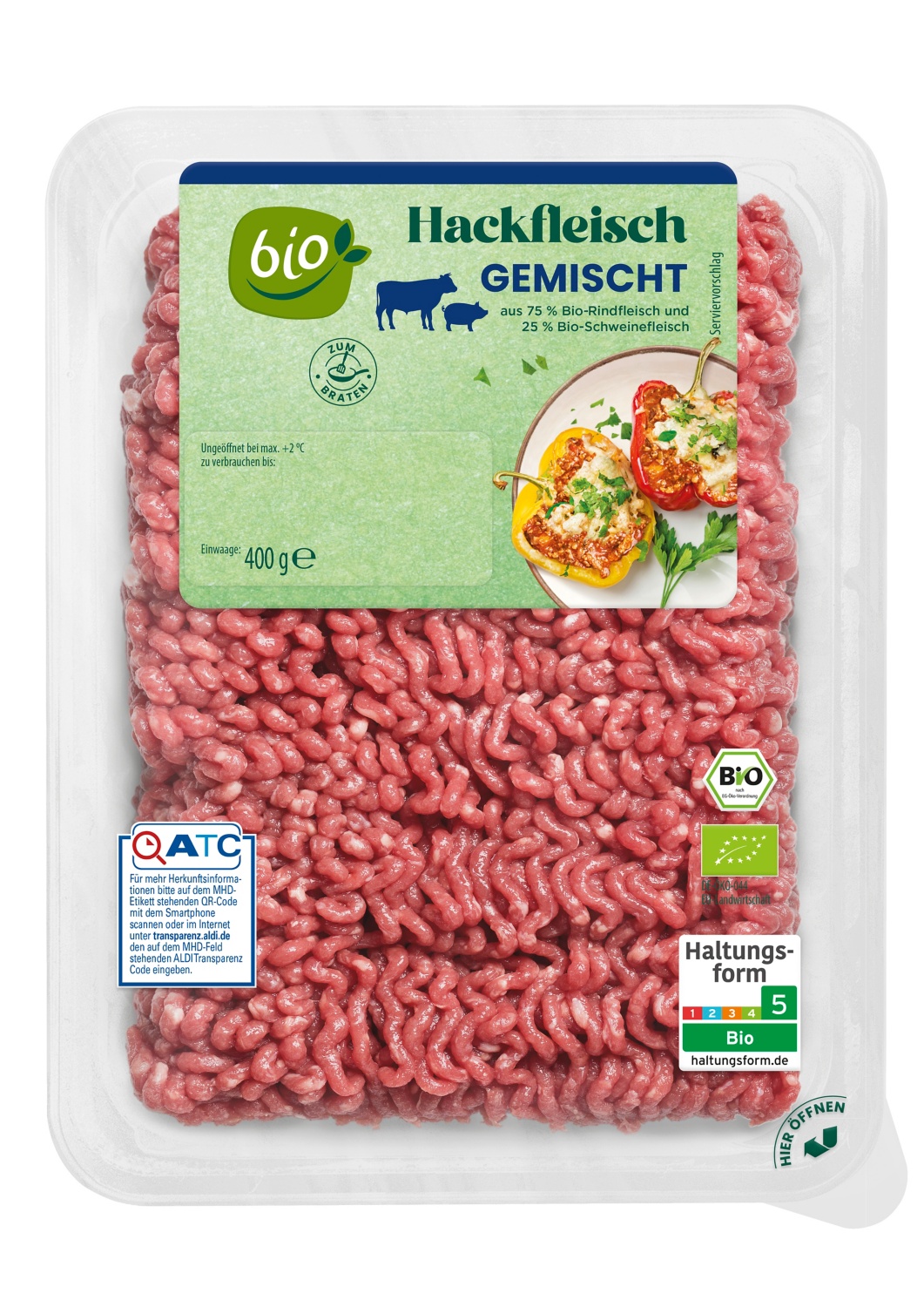 Zu 75 % aus Bio-Rindfleisch und 25 % Bio-Schweinefleisch