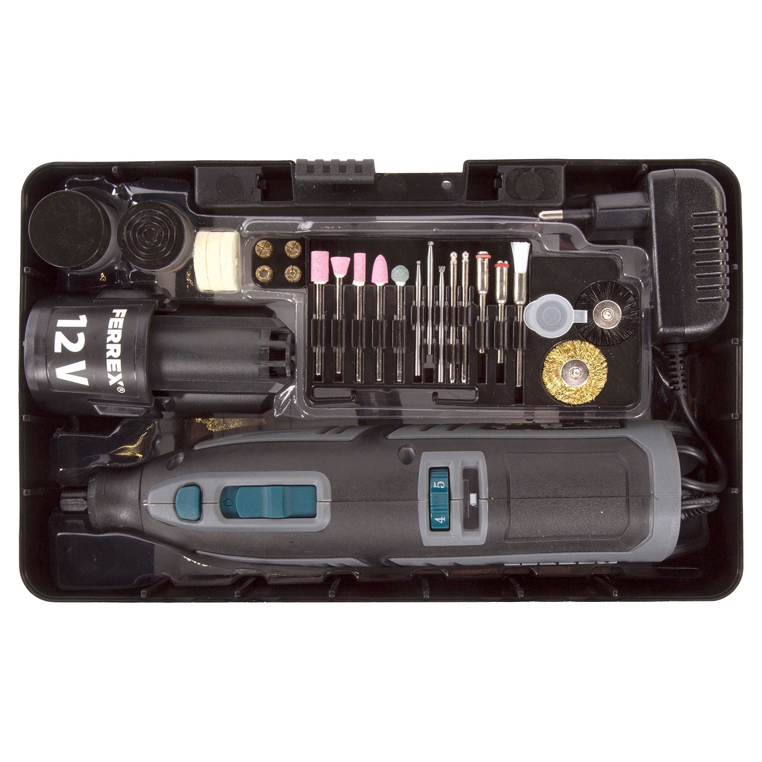 - Das FERREX 12 V Rotationswerkzeug ist das perfekte Werkzeug zum Fräsen, Bohren, Polieren, Schleifen und mehr! Es wird sogar mit 75 Stück Zubehör für all diese verschiedenen Zwecke geliefert, sodass Sie sofort loslegen können