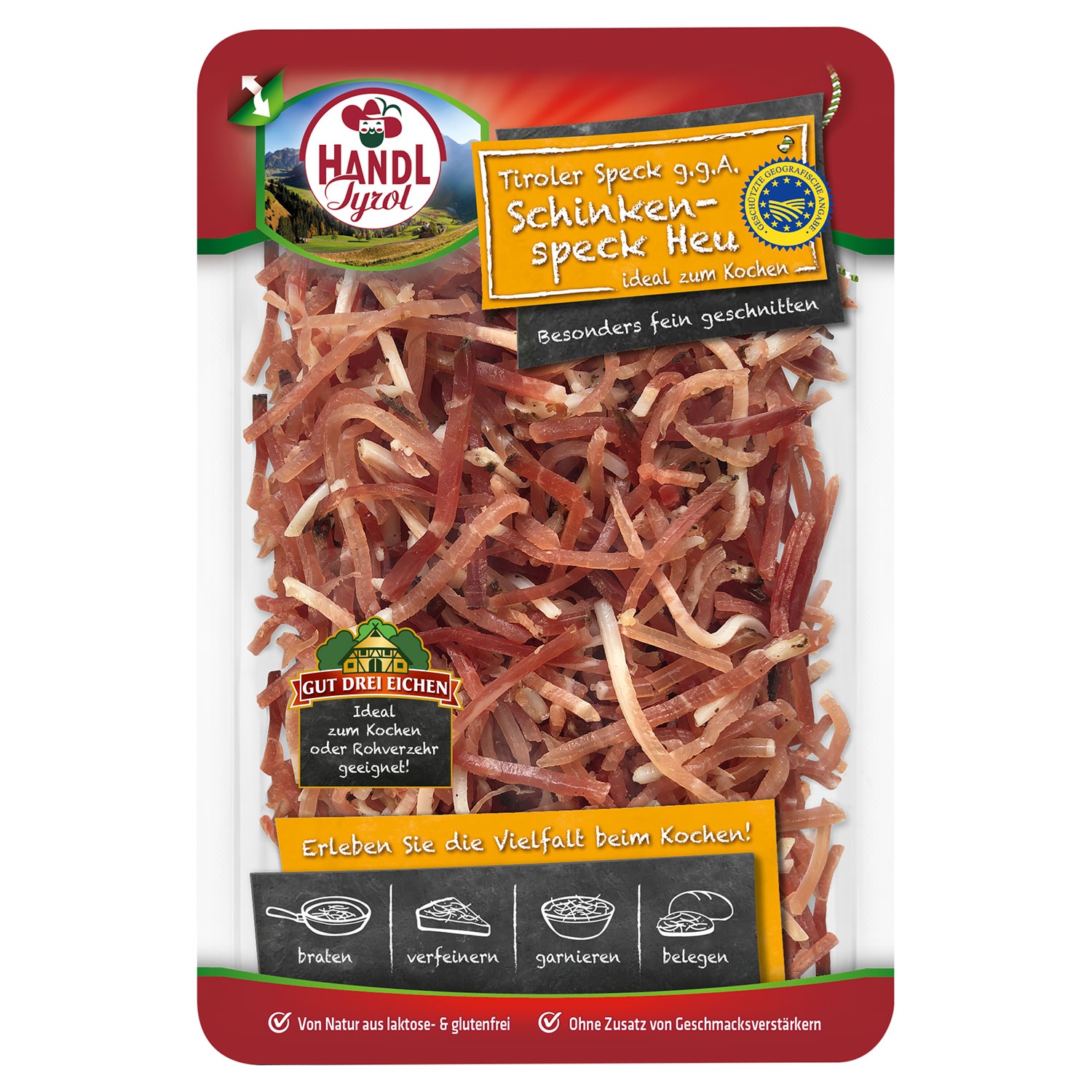 - Das Tiroler Speck g.g.A. Schinkenspeck HEU sind besonders feine, zarte Julienne-Streifen die vielfältig beim Kochen verwendet werden können. Zum Braten, Verfeinern, Garnieren oder Belegen, der Fantasie sind kaum Grenzen gesetzt.