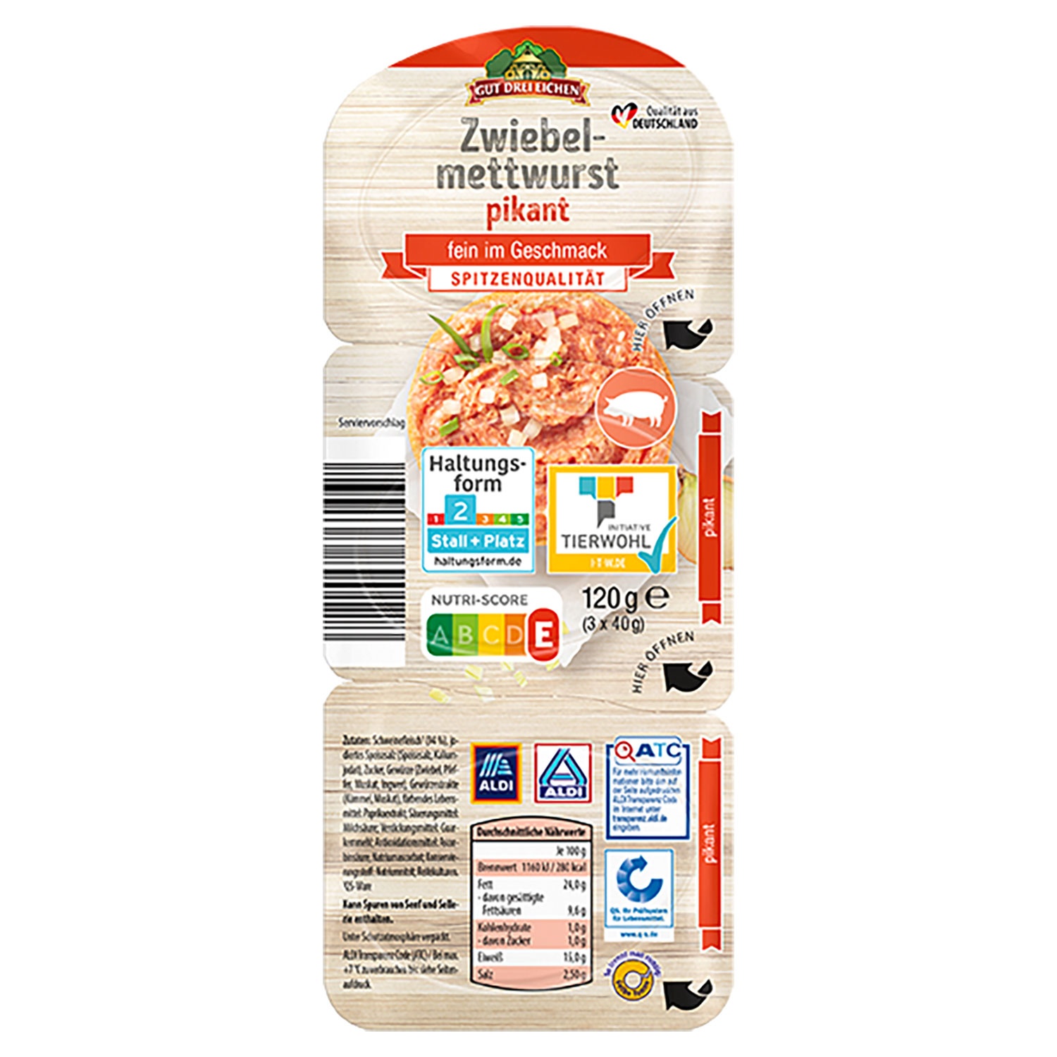 Zwiebelmettwurst in einer Verpackung mit drei kleinen Schalen, die einzeln zu öffnen sind