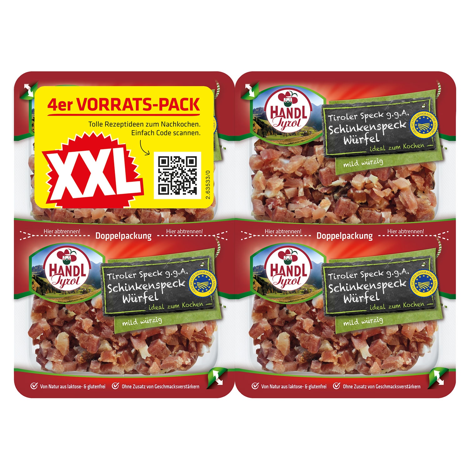 - Für die Herstellung von HANDL TYROL Tiroler Speck g.g.A. Schinkenspeck Würfel wird ausschließlich sorgsam geräucherter und lange in Tiroler Bergluft gereifter original Tiroler Speck g.g.A. verwendet und küchenfertig in praktische Würfel geschnitten