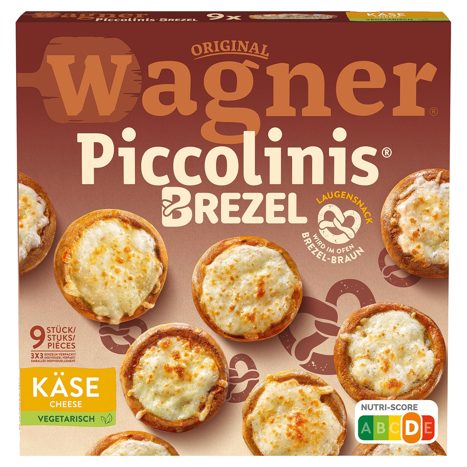 - Die Wagner Brezel-Piccolinis sind kleine Tiefkühlpizzas mit einem Boden aus vorgebackenem Brezelteig. Sie sind mit einer Kombination aus Mozzarella, Edamer und Hartkäse belegt, die für einen harmonischen Geschmack sorgt. Hergestellt aus 100 % echtem Käse und ohne künstliche Aromen oder Farbstoffe, lassen sie sich in rund 9 Minuten einfach zubereiten. Mit dem Nutri-Score D bieten sie eine praktische Option für einen herzhaften Snack oder eine Mahlzeit zu verschiedenen Gelegenheiten