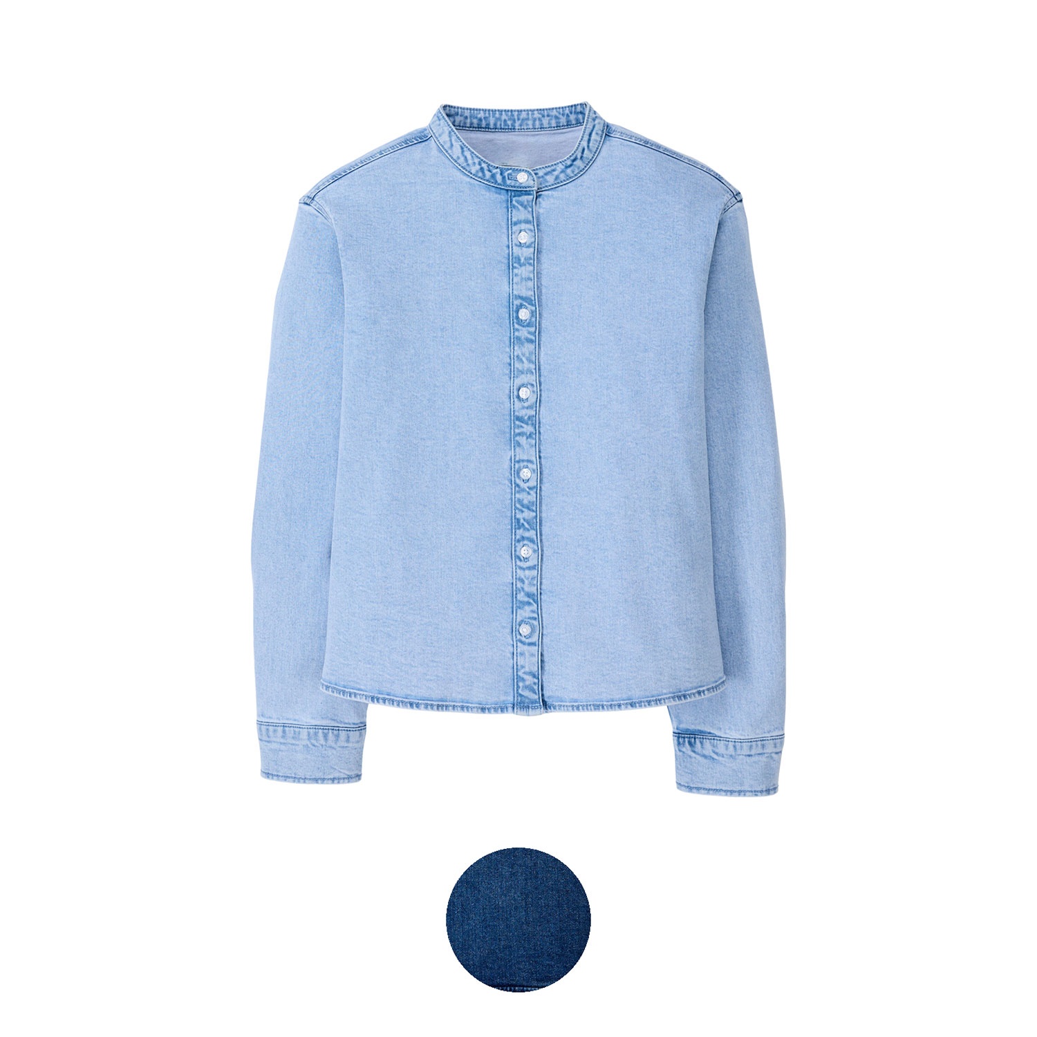 - Hellblau: Stehkragen, vorgeschobene Schulter, durchgehende Frontöffnung mit 4 Lochknöpfen