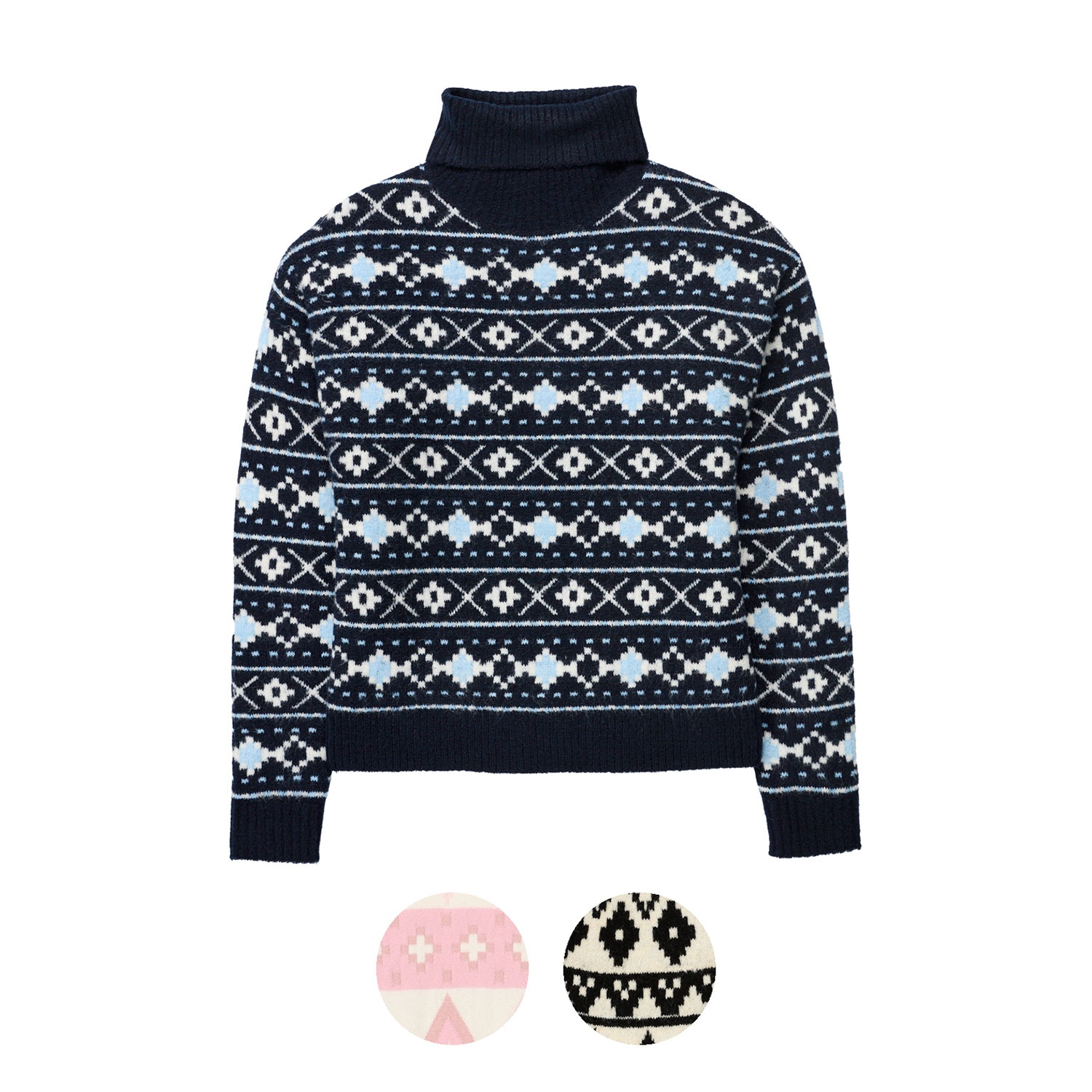 - Blau: Rollkragen, relaxed fit
