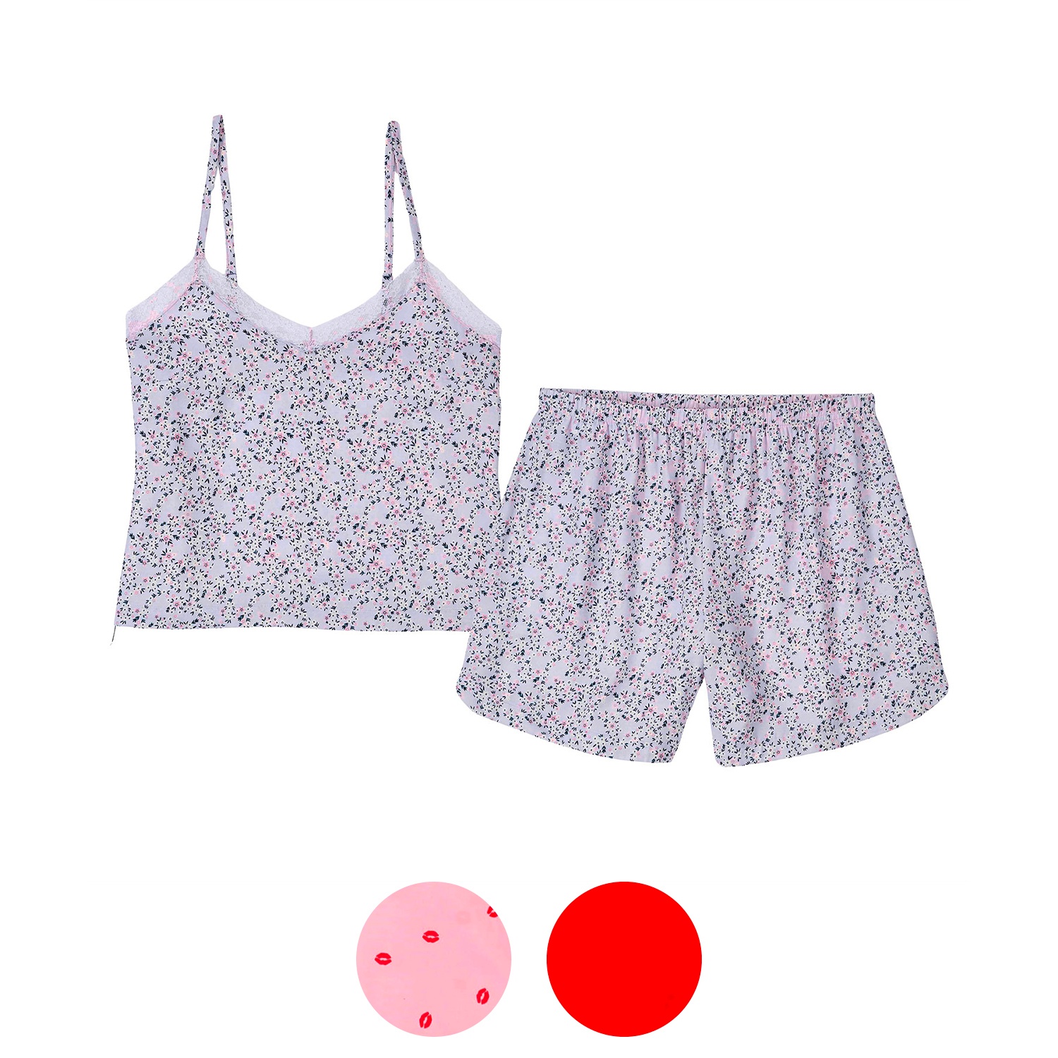 - Modell 2: Rot / Rosa, Oberteil: Lippen Allover-Print mit V-Ausschnitt, Shorts
