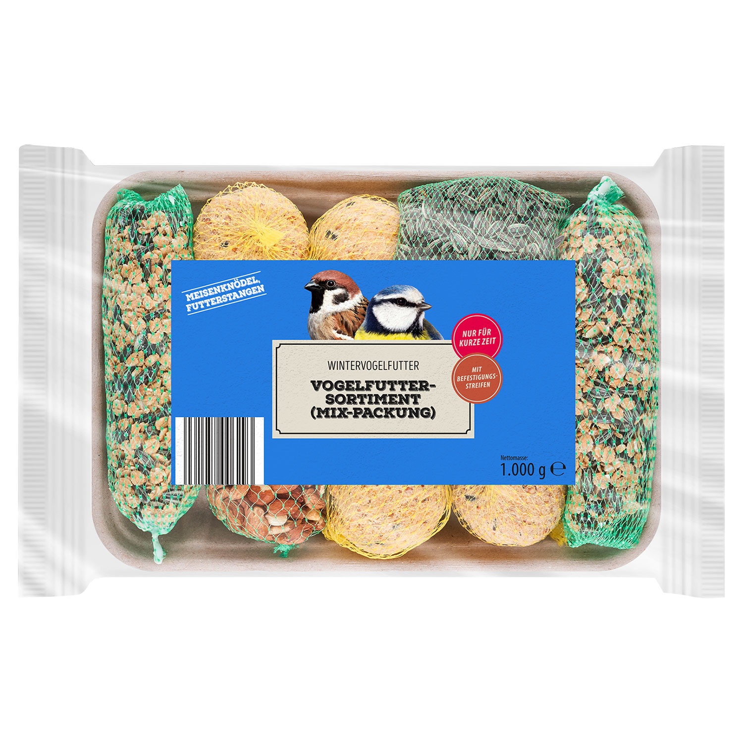 - 4 x Meisenknödel, 2 x Futterstangen, 1 x Sonnenblumenkernbeutel, 1 x Erdnusskernbeutel