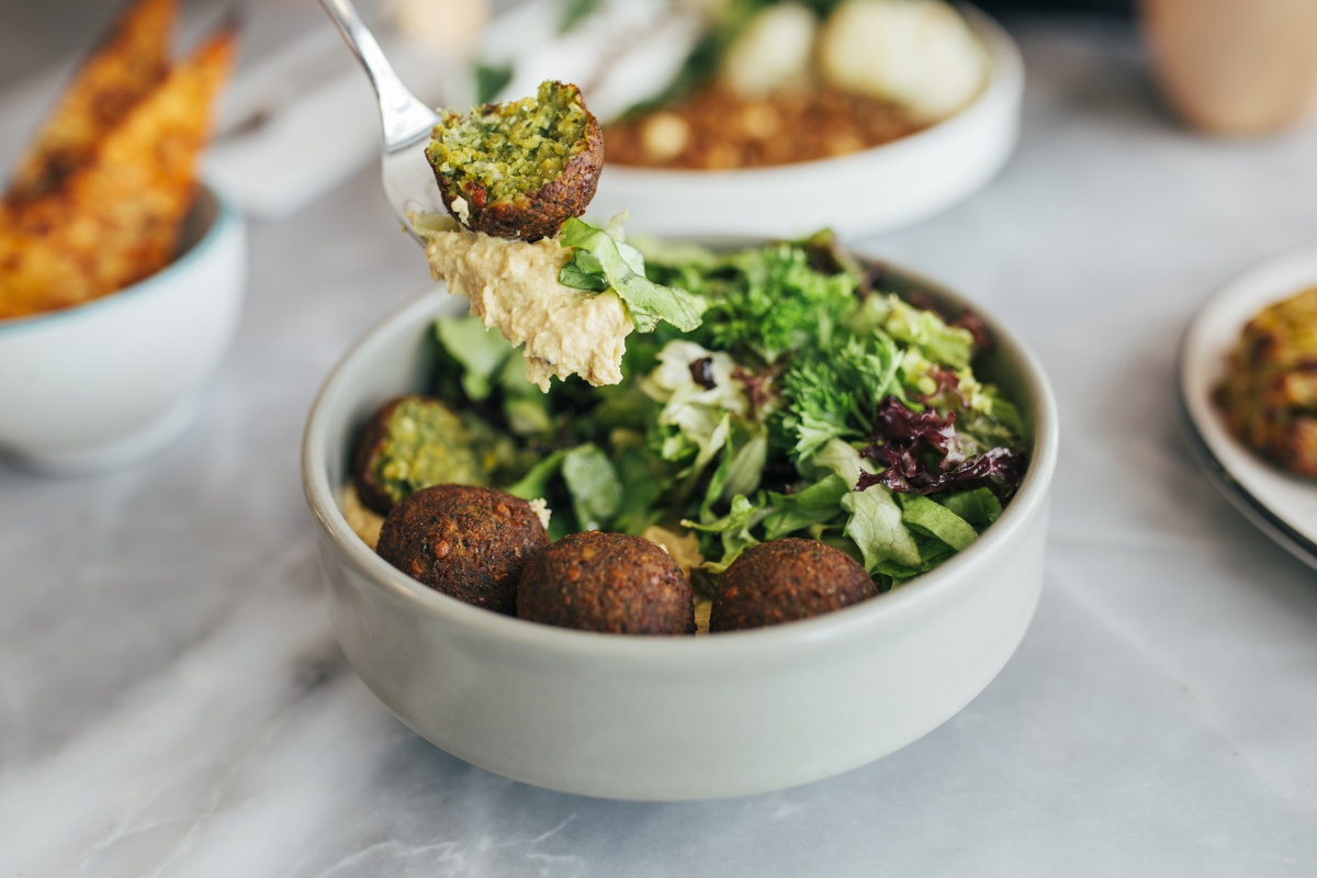 Frische vegetarische und vegane Fertiggerichte: Salate, Wraps und Sandwiches.