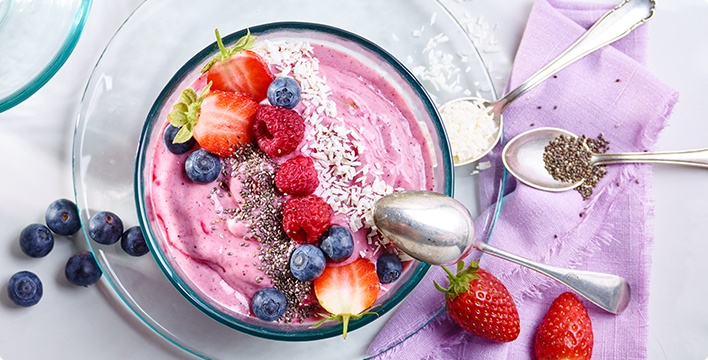 Gesundes Frühstück in kurze Zeit: lecker, fruchtig, leicht. Durch die gefrorenen Früchte ist die Bowl in jeder Jahreszeit machbar. Zum Rezept