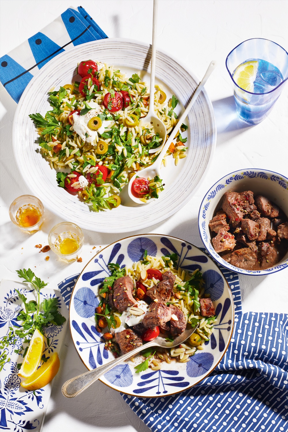 5. Für den Dip den restlichen Knoblauch schälen und pressen. Mit dem Joghurt, Salz, Pfeffer, 1 Spritzer Zitronensaft und etwas Honig verrühren. Das Fleisch mit Kritharaki und dem Dip servieren.